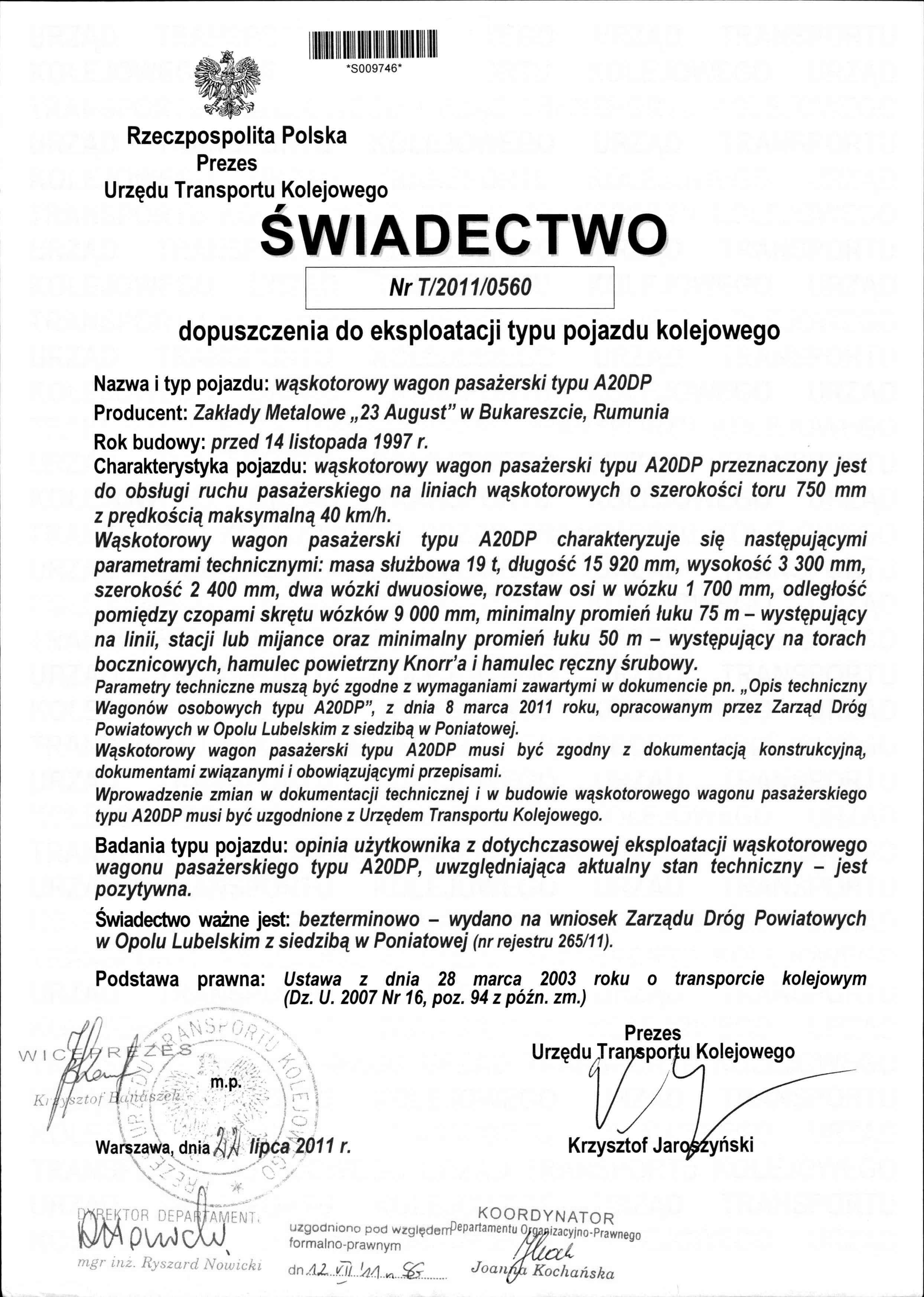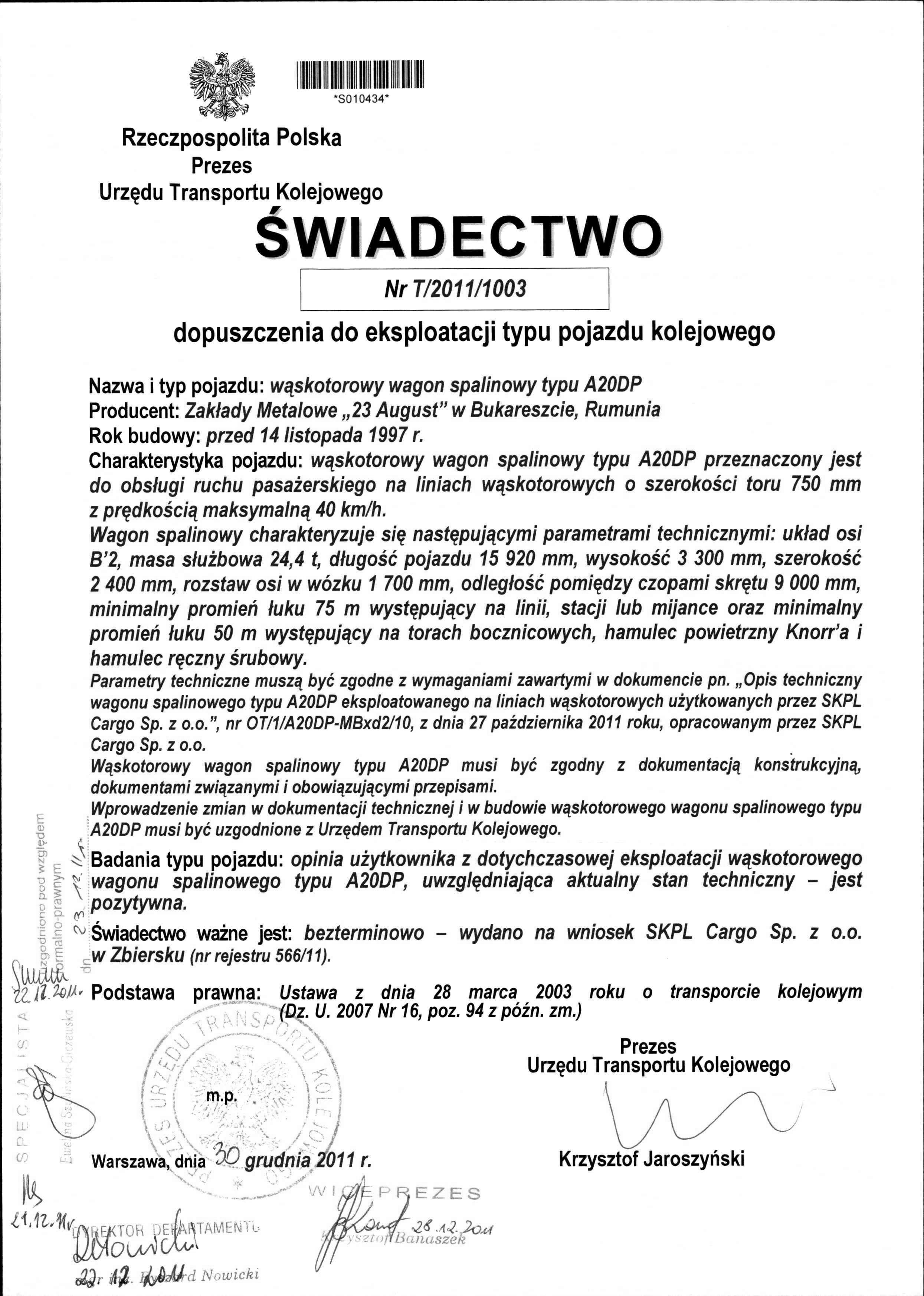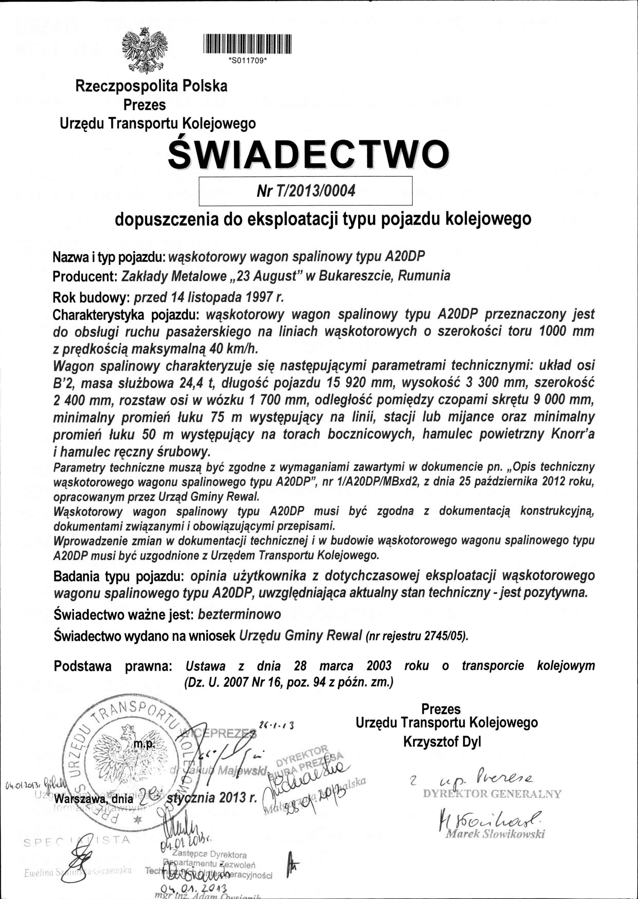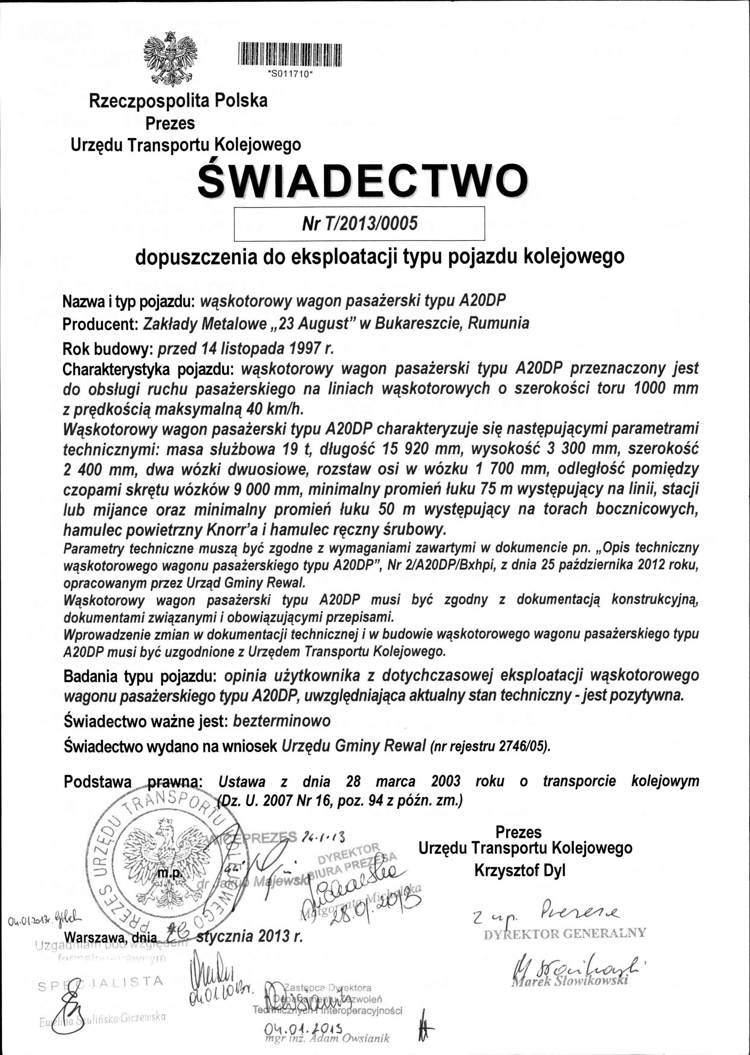 | Świadectwo typu | T/2010/0372; T/2011/0124; T/2011/0803; T/2011/1003; T/2013/0004;
