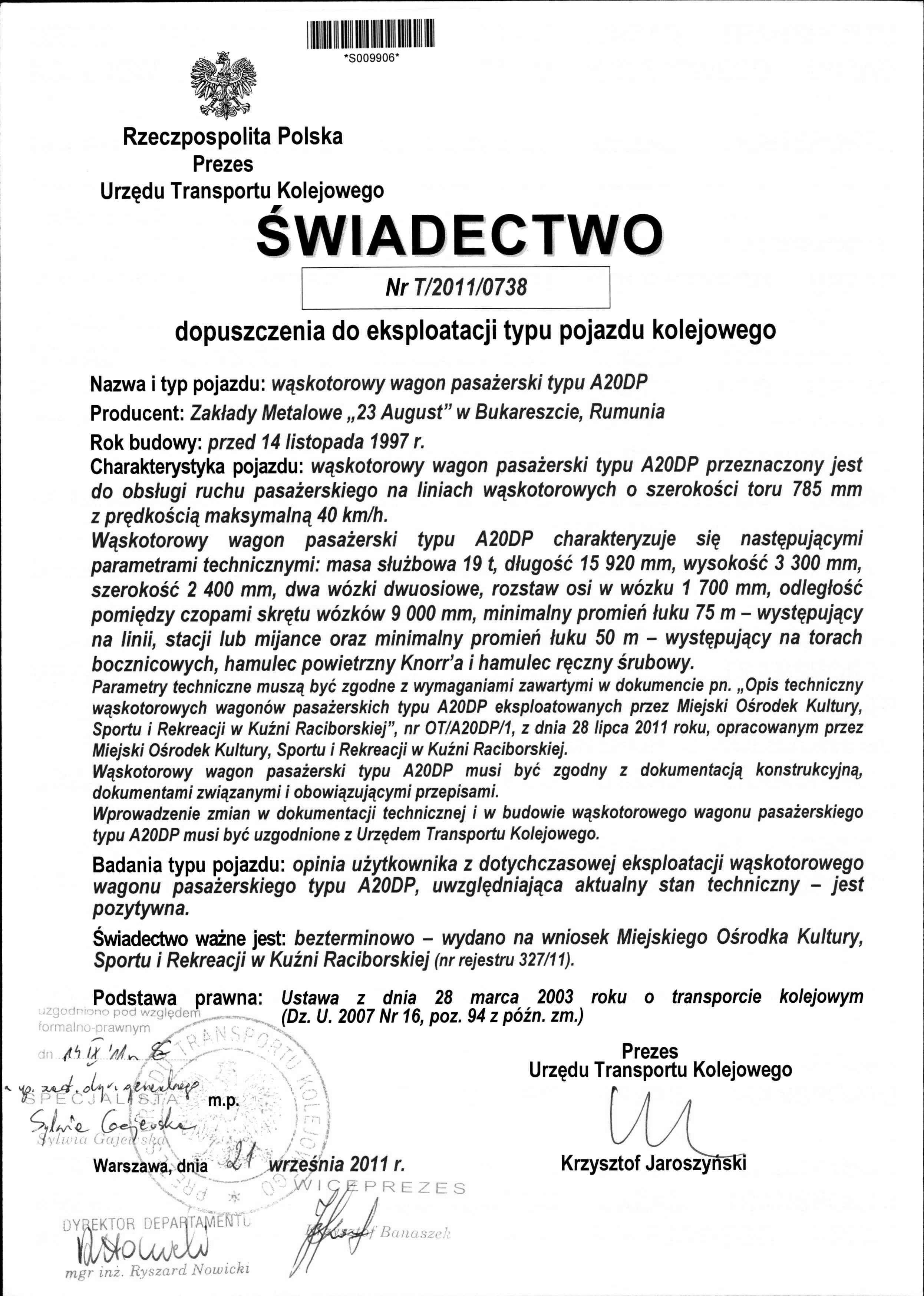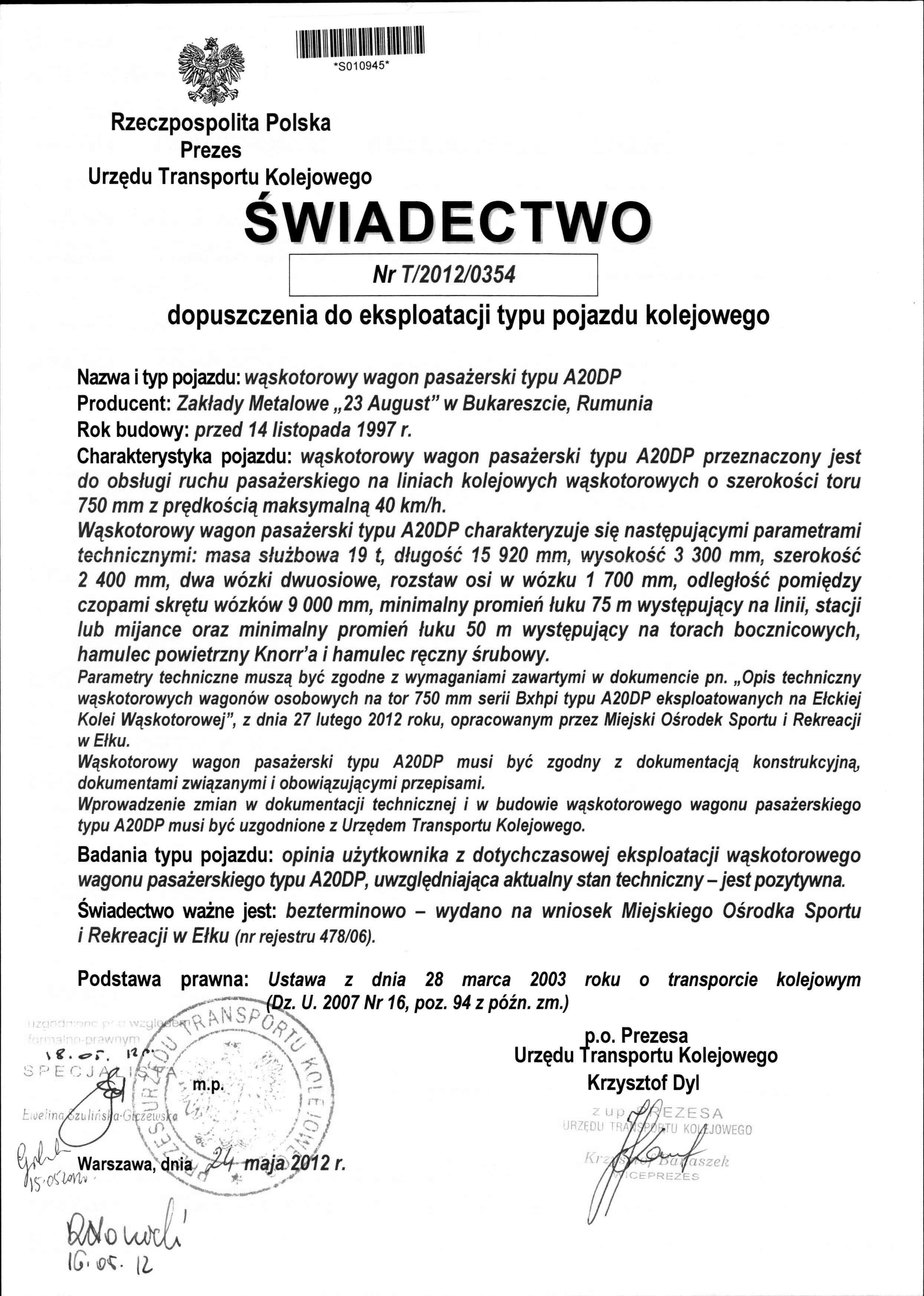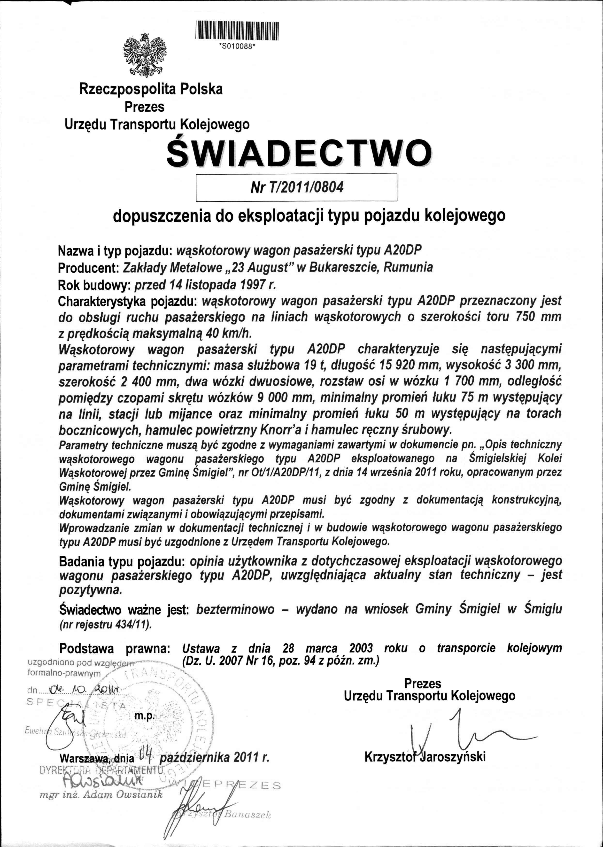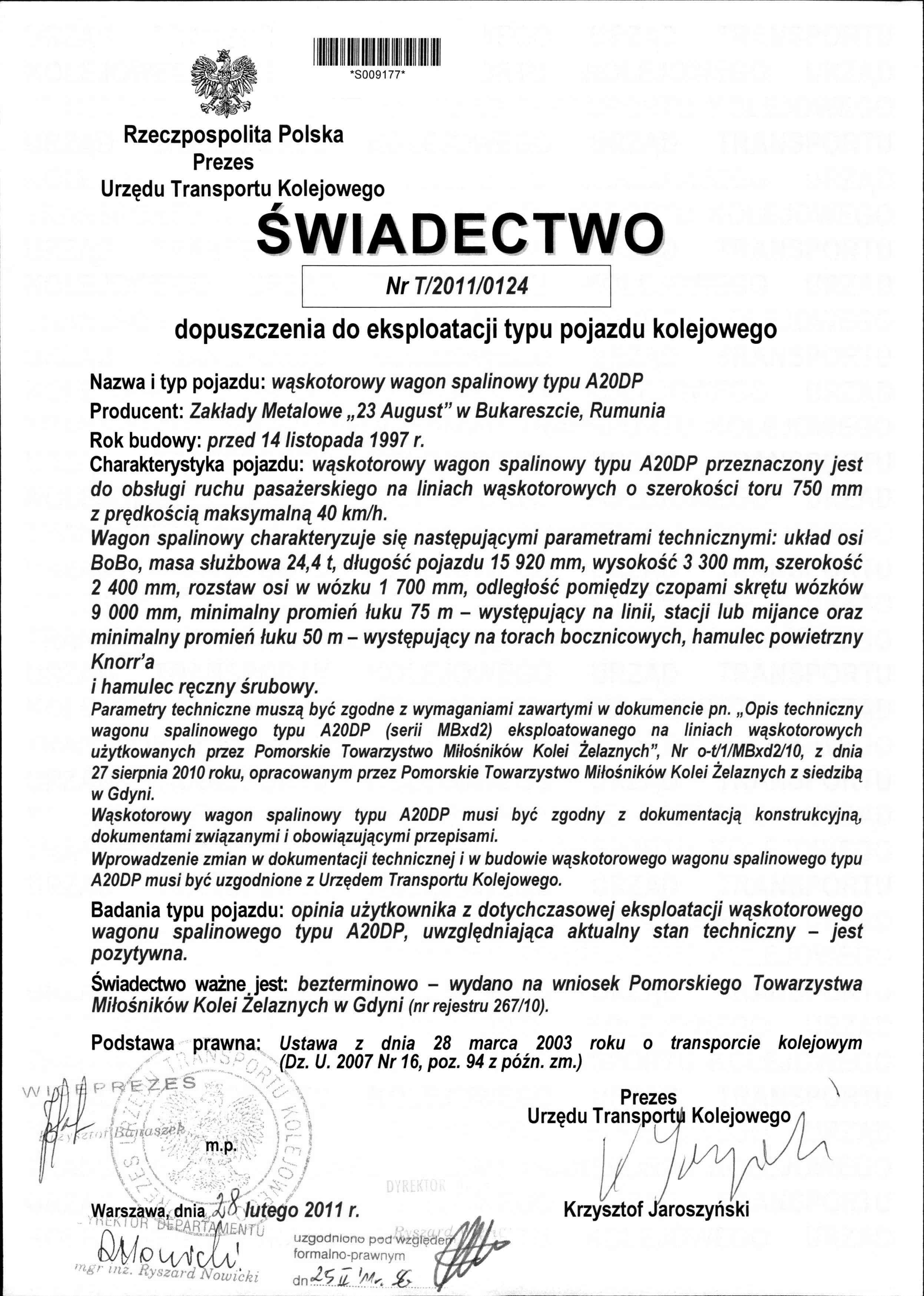 | Świadectwo typu | T/2010/0372; T/2011/0124; T/2011/0803; T/2011/1003; T/2013/0004;