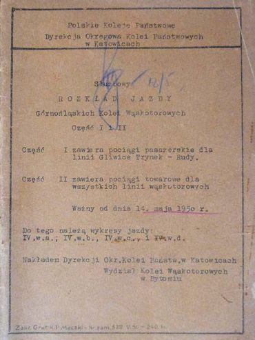 Służbowy Rozkład Jazdy Górnośląskich Kolei Wąskotorowych część I i II ważny od 14 maja 1950 roku wydany został nakładem Dyrekcji Okręgowej Kolei Państwowych w Katowicach, Wydział Kolei Wąskotorowych w Bytomiu. Druk zlecono Zakładom Graficznym Kolei Państwowych w Maczkach, a nakład wyniósł 240 egzemplarzy. Poza rozkładem jazdy pociągów pasażerskich i towarowych, zeszyt zawiera również informacje, które w późniejszym okresie ujmowane były w oddzielnych dodatkach.