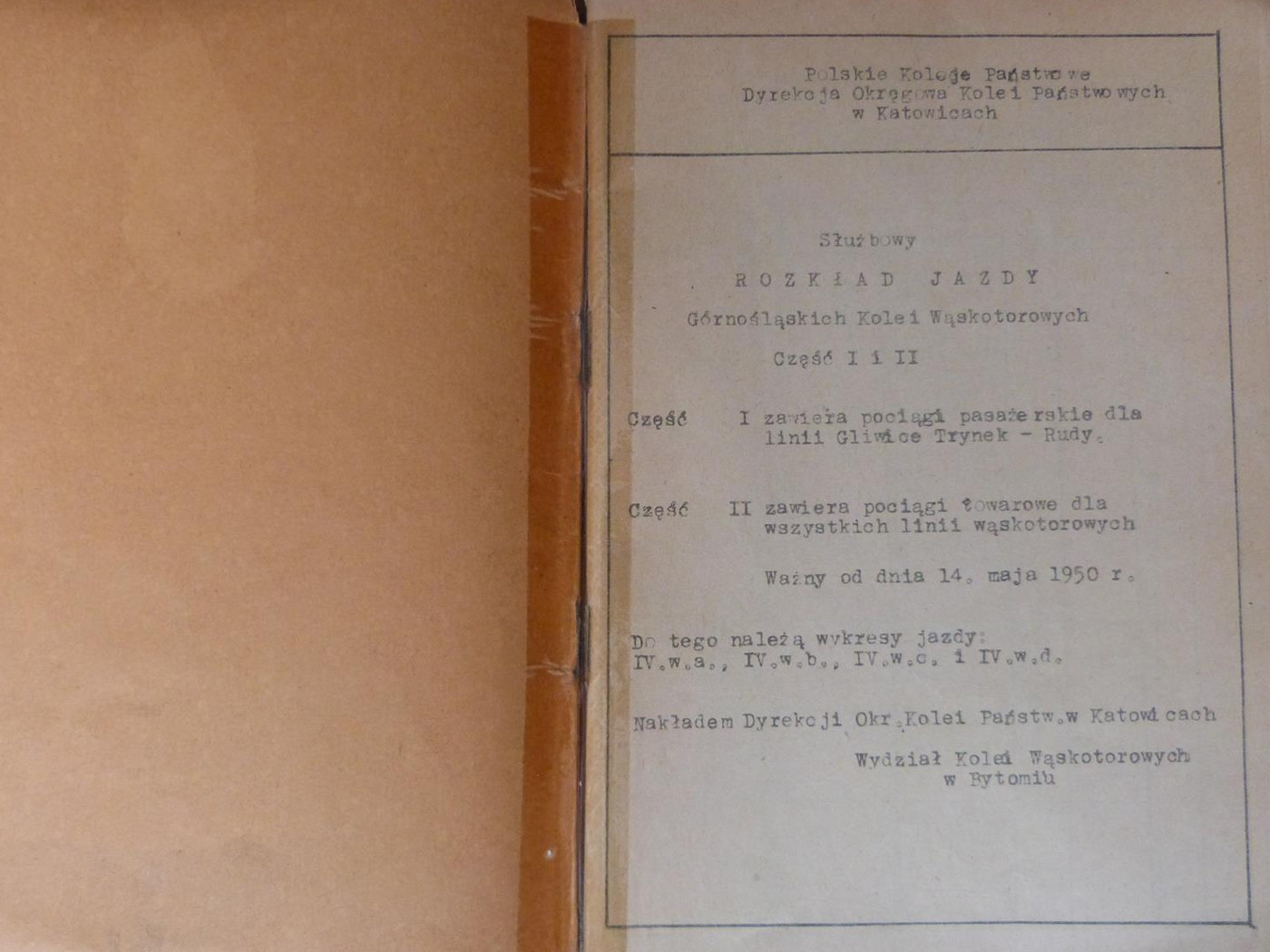 Służbowy rozkład jazdy Górnośląskich Kolei Wąskotorowych ważny od 14 maja 1950 roku