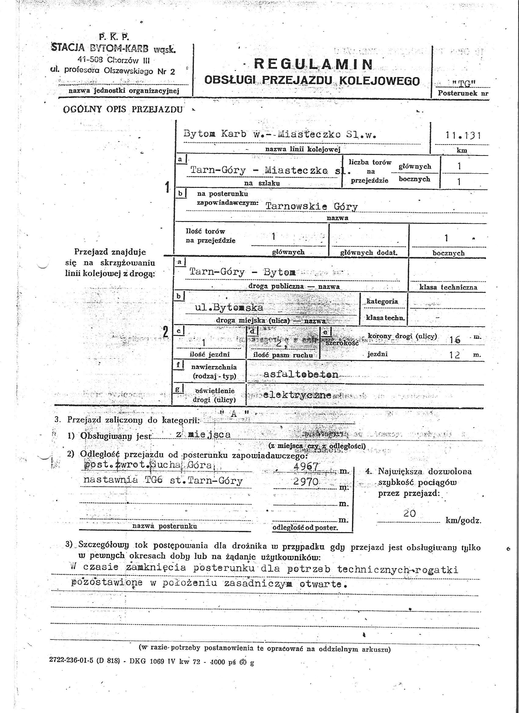 Regulamin obsługi przejazdu kolejowego zlokalizowanego na ulicy Bytomskiej (Tarnowskie Góry), linia kolejowa Bytom Karb Wąskotorowy - Miasteczko Śląskie Wąskotorowe. Dokładna data sporządzenia nie jest znana. Najprawdopodobniej lata dziewięćdziesiąte XX wieku. Ze zbiorów Kondrada Sieradzkiego.