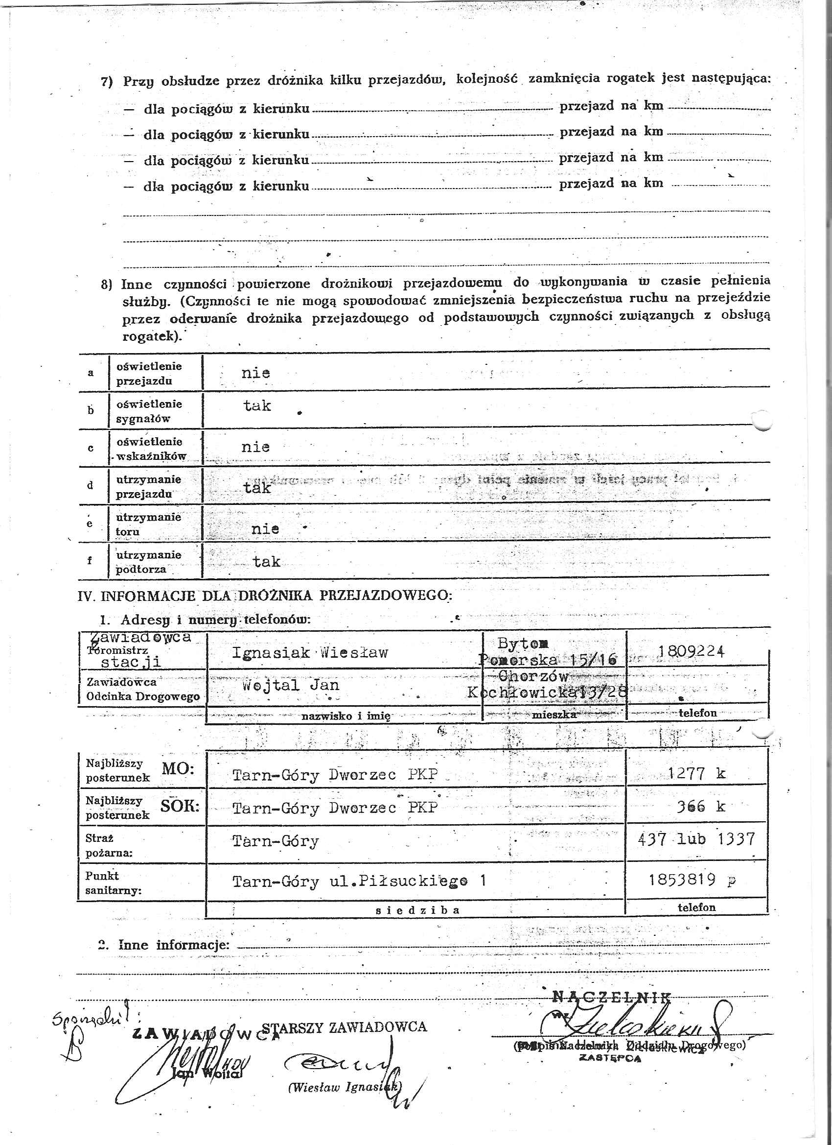 Regulamin obsługi przejazdu kolejowego zlokalizowanego na ulicy Bytomskiej (Tarnowskie Góry), linia kolejowa Bytom Karb Wąskotorowy - Miasteczko Śląskie Wąskotorowe. Dokładna data sporządzenia nie jest znana. Najprawdopodobniej lata dziewięćdziesiąte XX wieku. Ze zbiorów Kondrada Sieradzkiego.