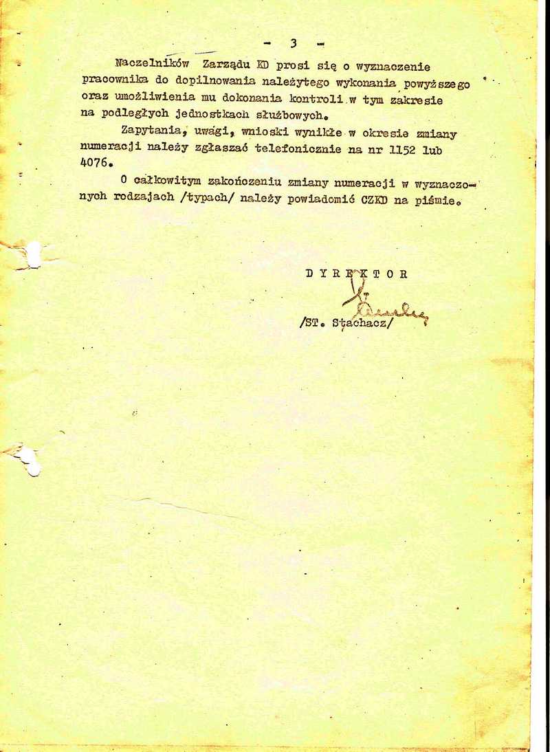 Pismo Ministerstwa Komunikacji - Centralnego Zarządu Kolei Dojazdowych nr 4a-616-7/74 z dnia 21 sierpnia 1974 w sprawie wdrożenia systemu numeracji wąskotorowego taboru kolejowego "CETAR". Strona 3.