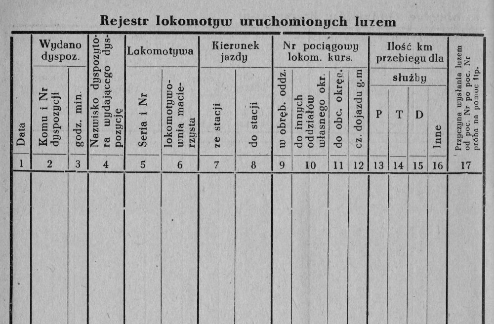 Wzór rejestru lokomotyw uruchomionych luzem według Instrukcji R-23 dla dyspozytora przewozów