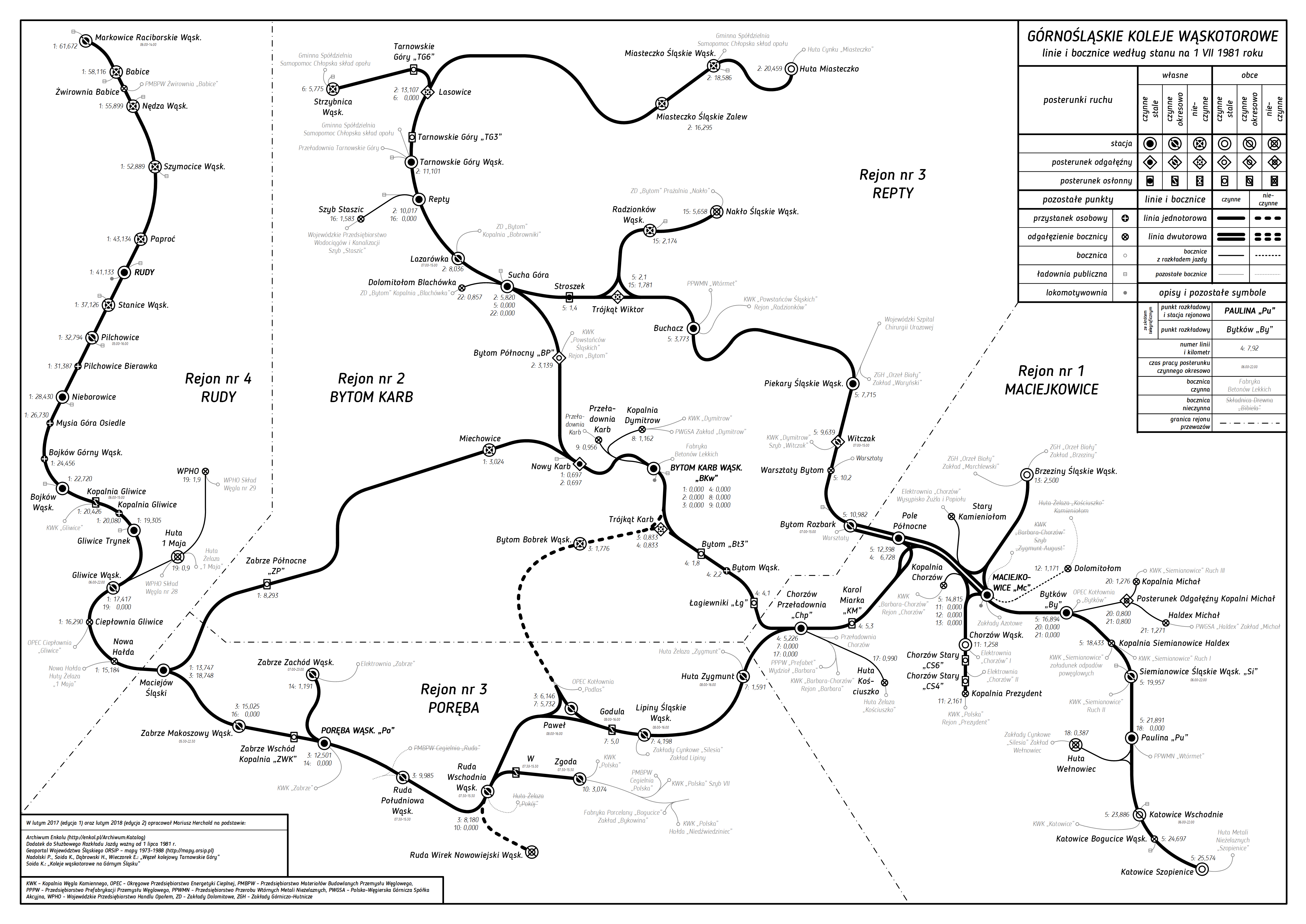 Linie i bocznice Górnośląskich Kolei Wąskotorowych według stanu na 1 VII 1981