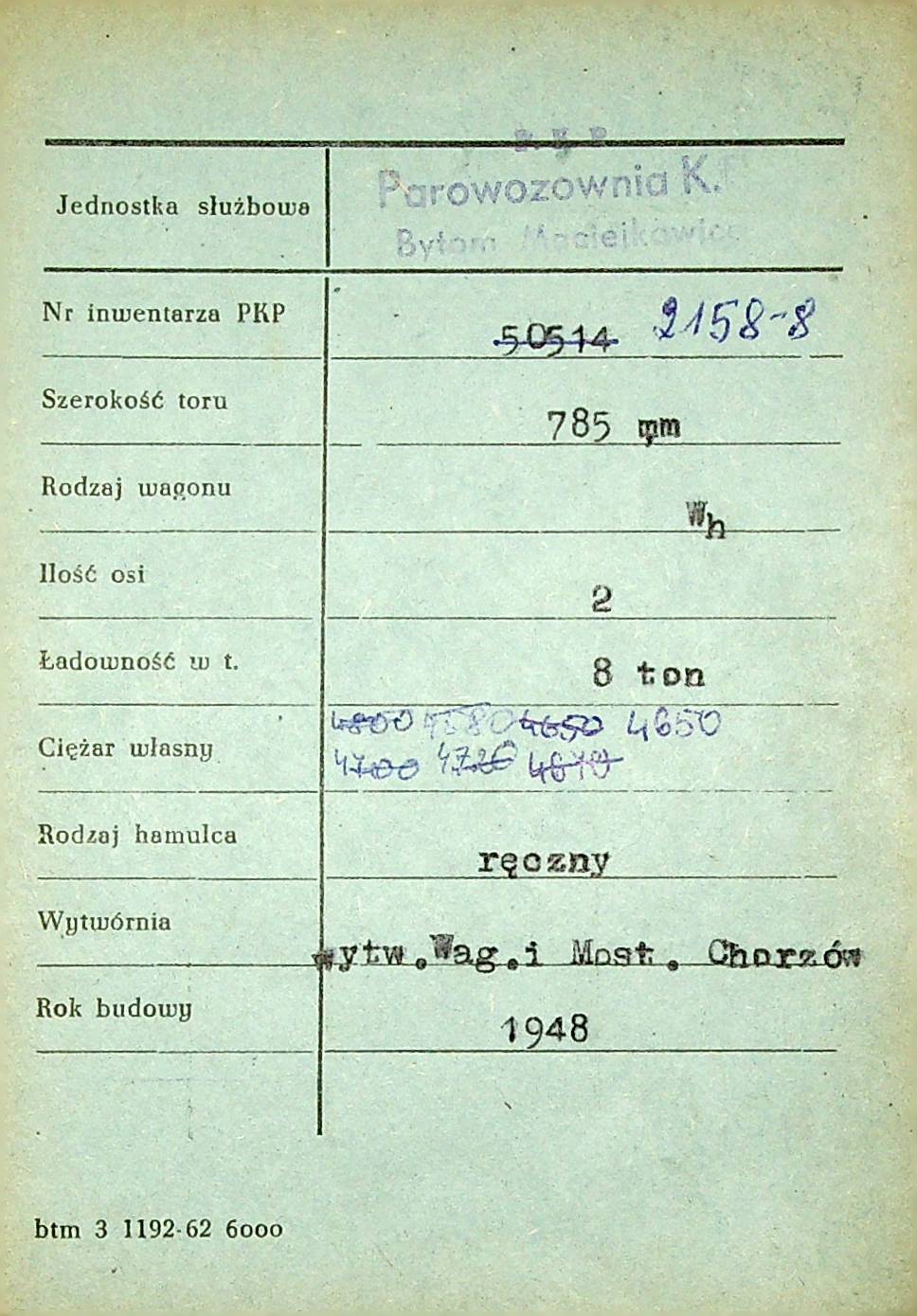 Karta wagonu Górnośląskich Kolei Wąskotorowych |