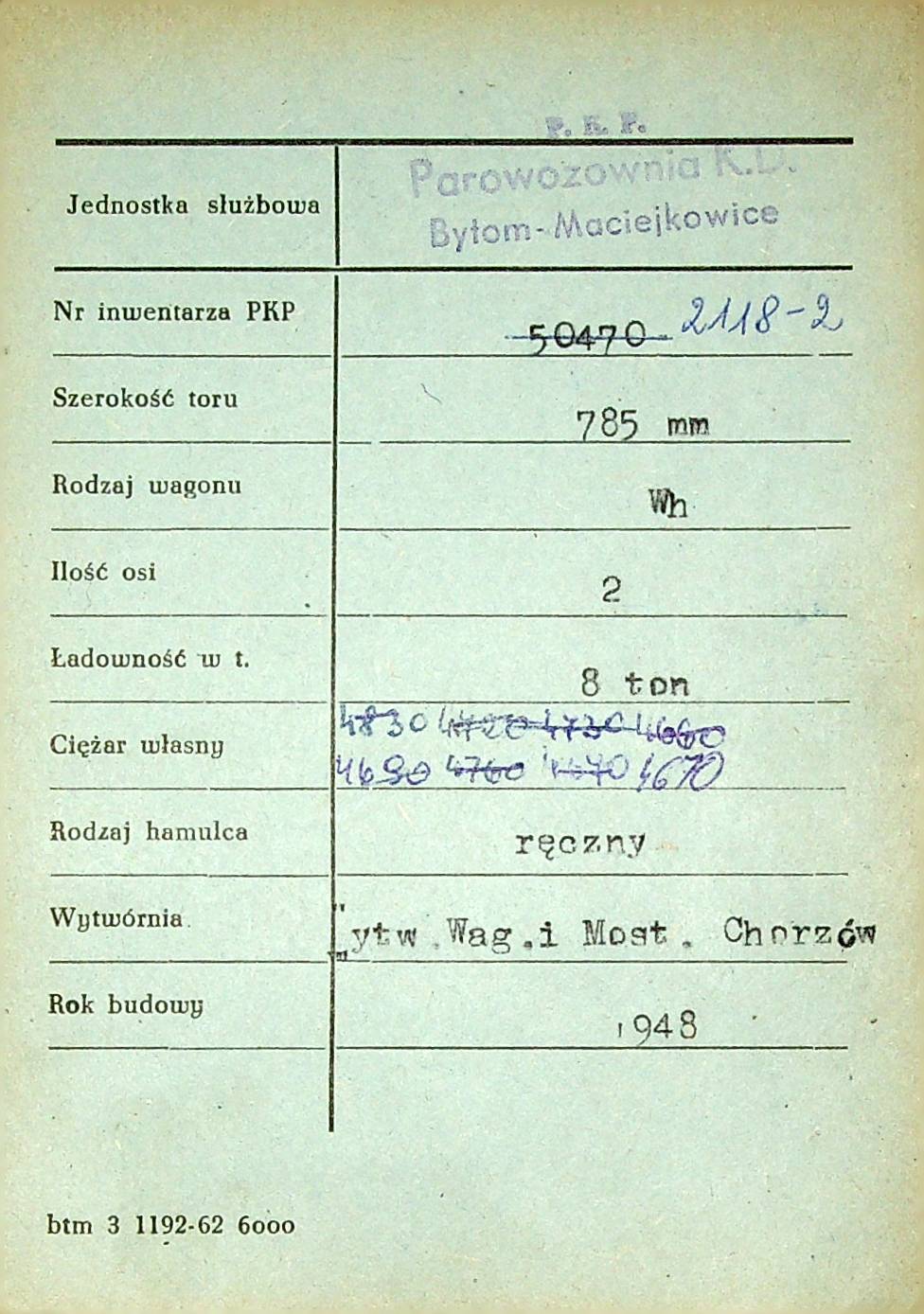 Karta wagonu Górnośląskich Kolei Wąskotorowych |