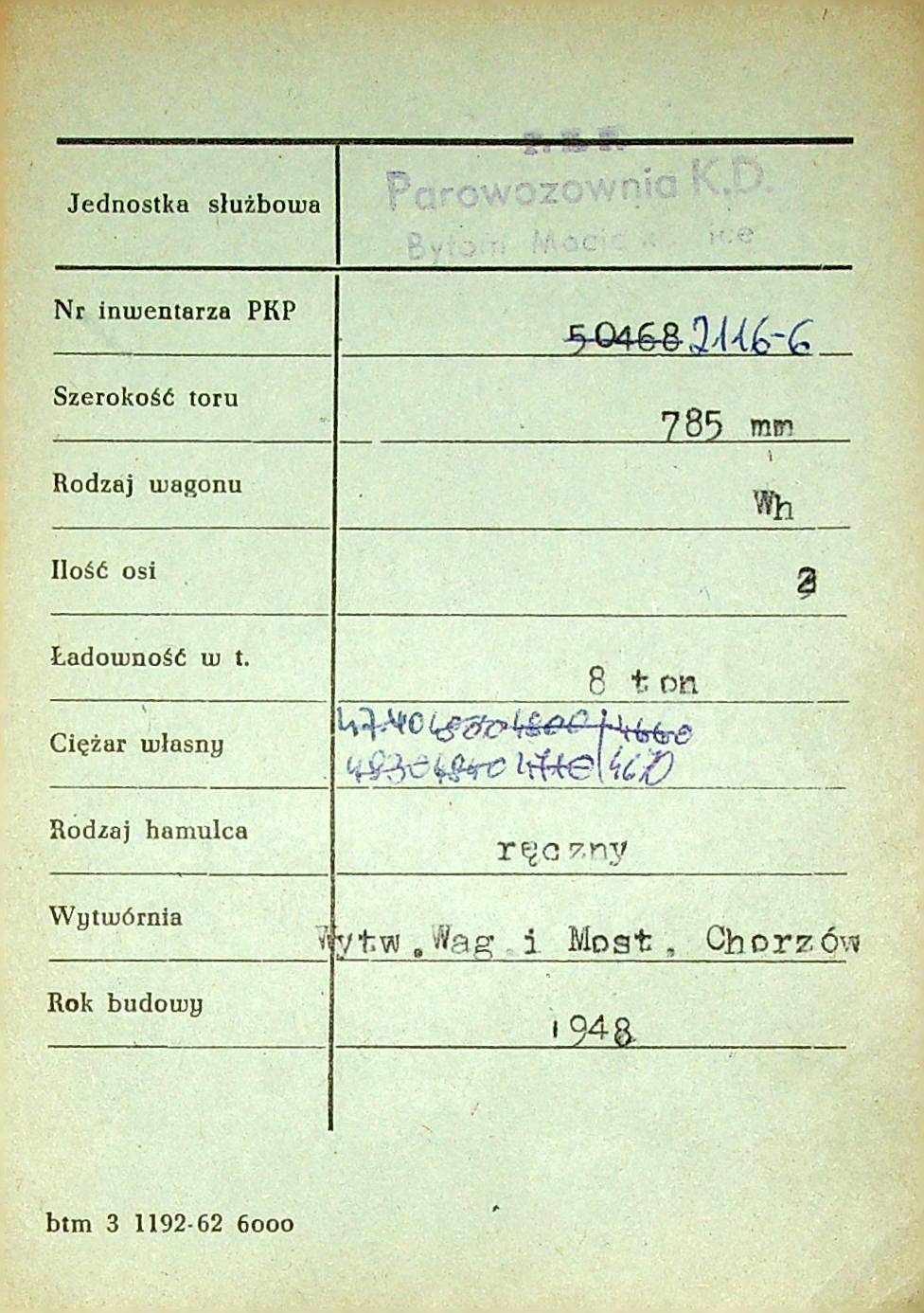 Karta wagonu Górnośląskich Kolei Wąskotorowych |