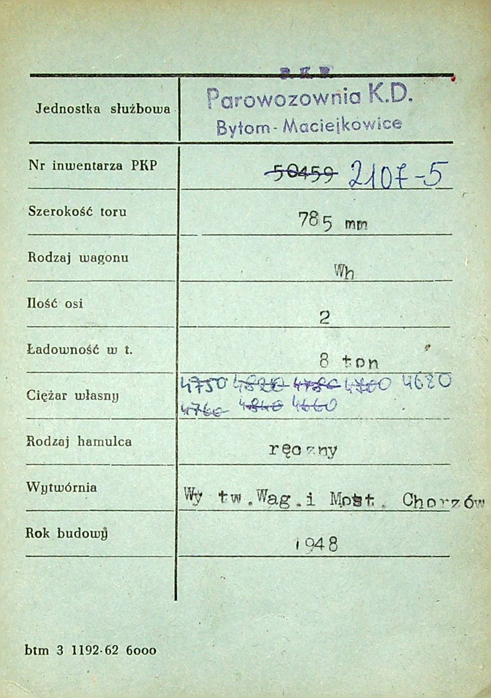 Karta wagonu Górnośląskich Kolei Wąskotorowych |