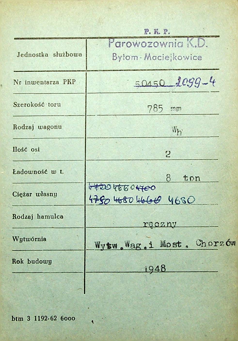 Karta wagonu Górnośląskich Kolei Wąskotorowych |
