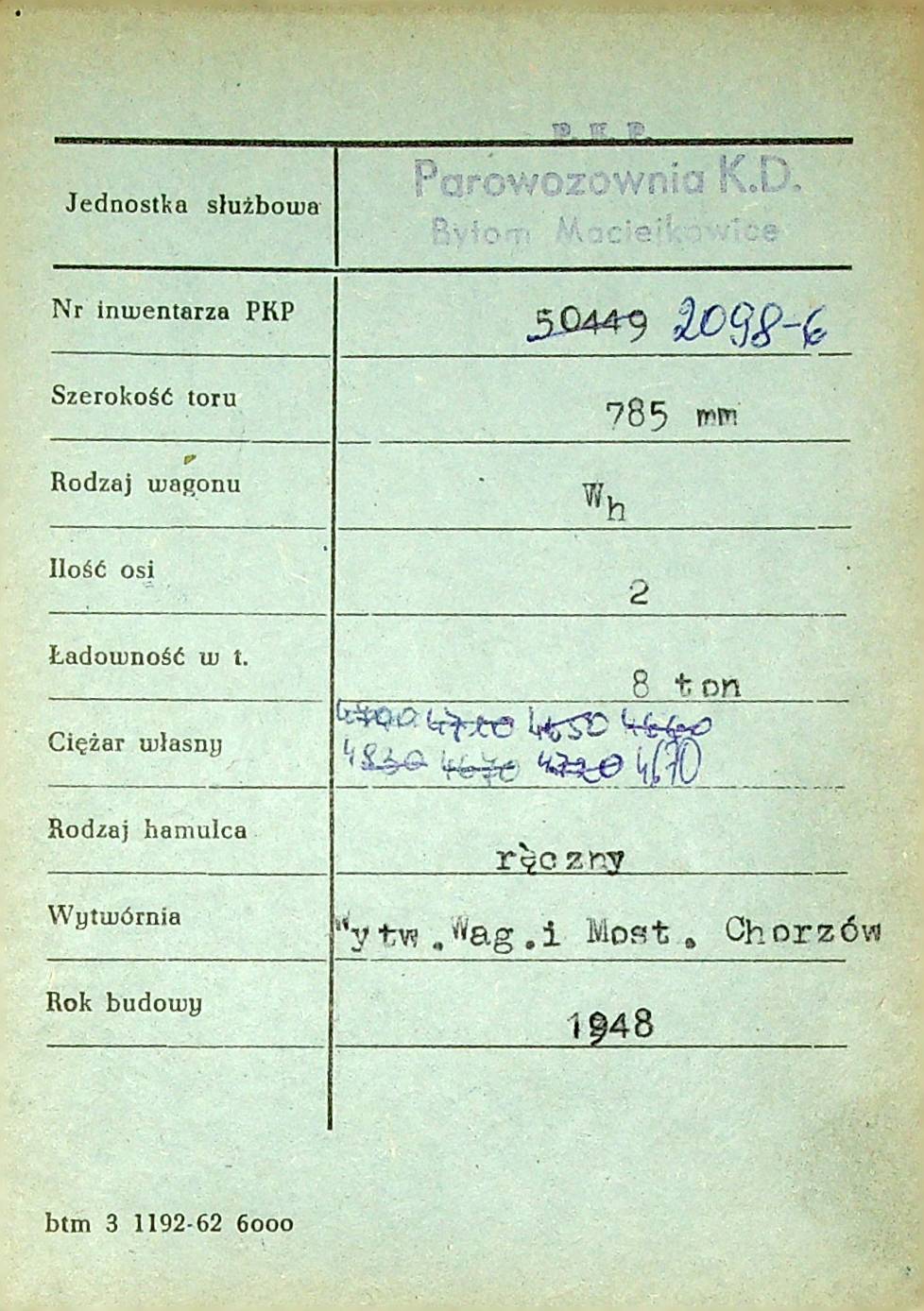Karta wagonu Górnośląskich Kolei Wąskotorowych |