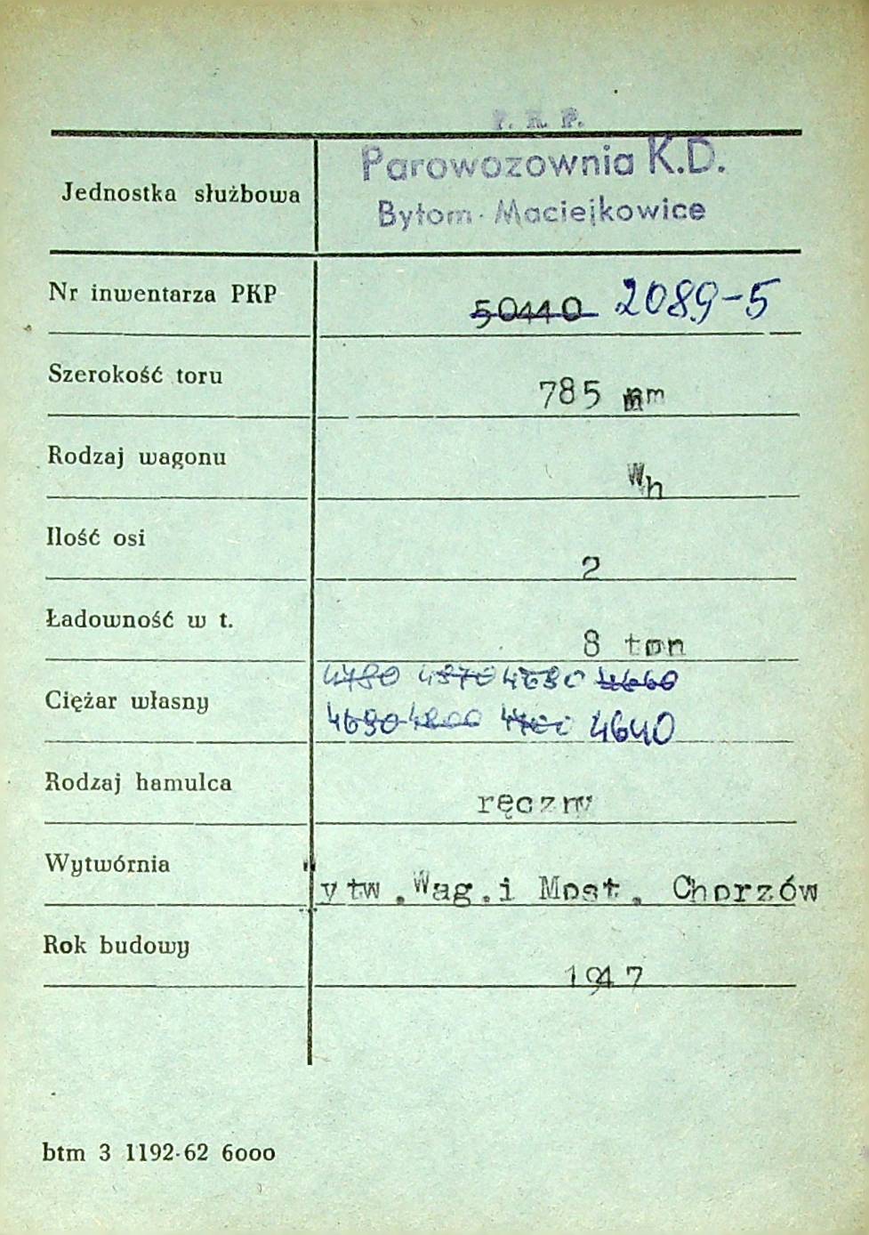 Karta wagonu Górnośląskich Kolei Wąskotorowych |