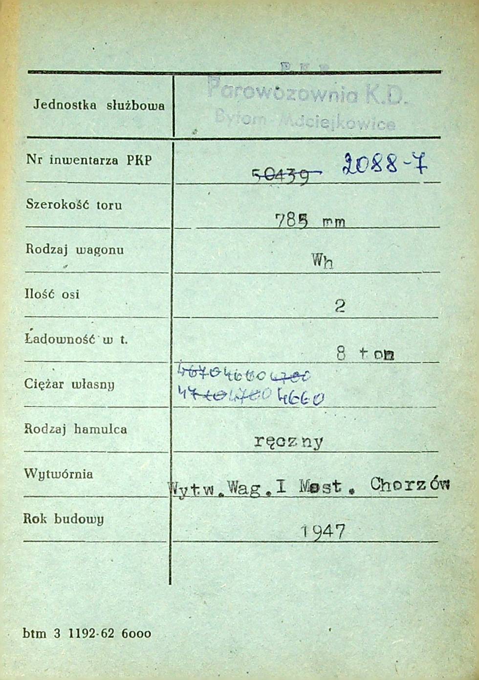 Karta wagonu Górnośląskich Kolei Wąskotorowych |