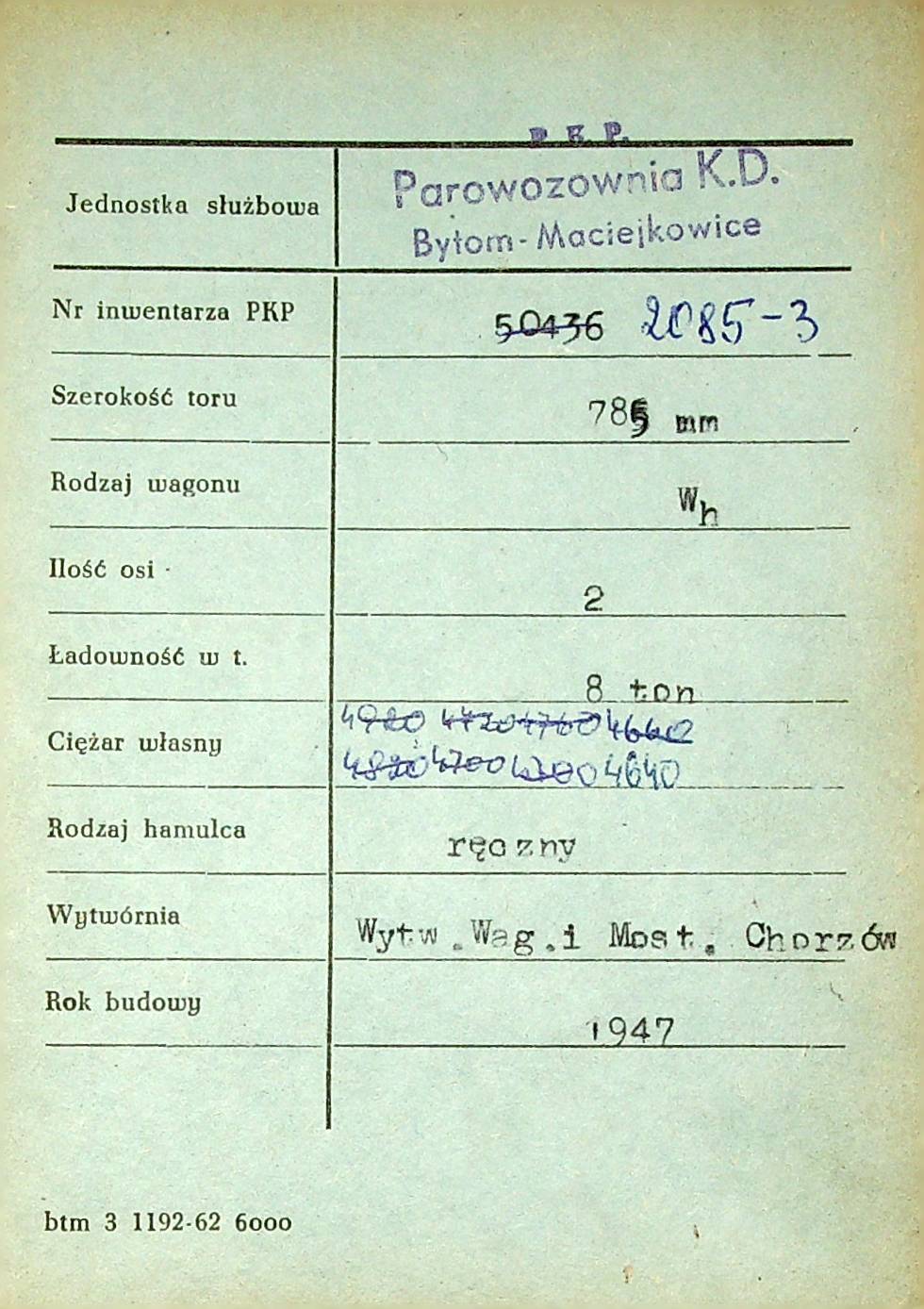 Karta wagonu Górnośląskich Kolei Wąskotorowych |