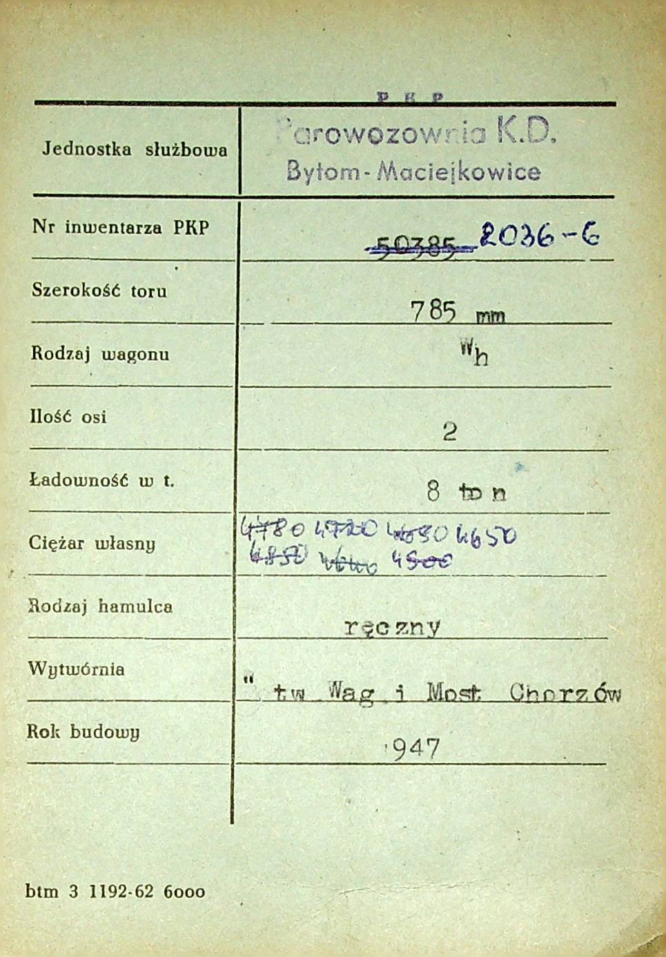 Karta wagonu Górnośląskich Kolei Wąskotorowych |