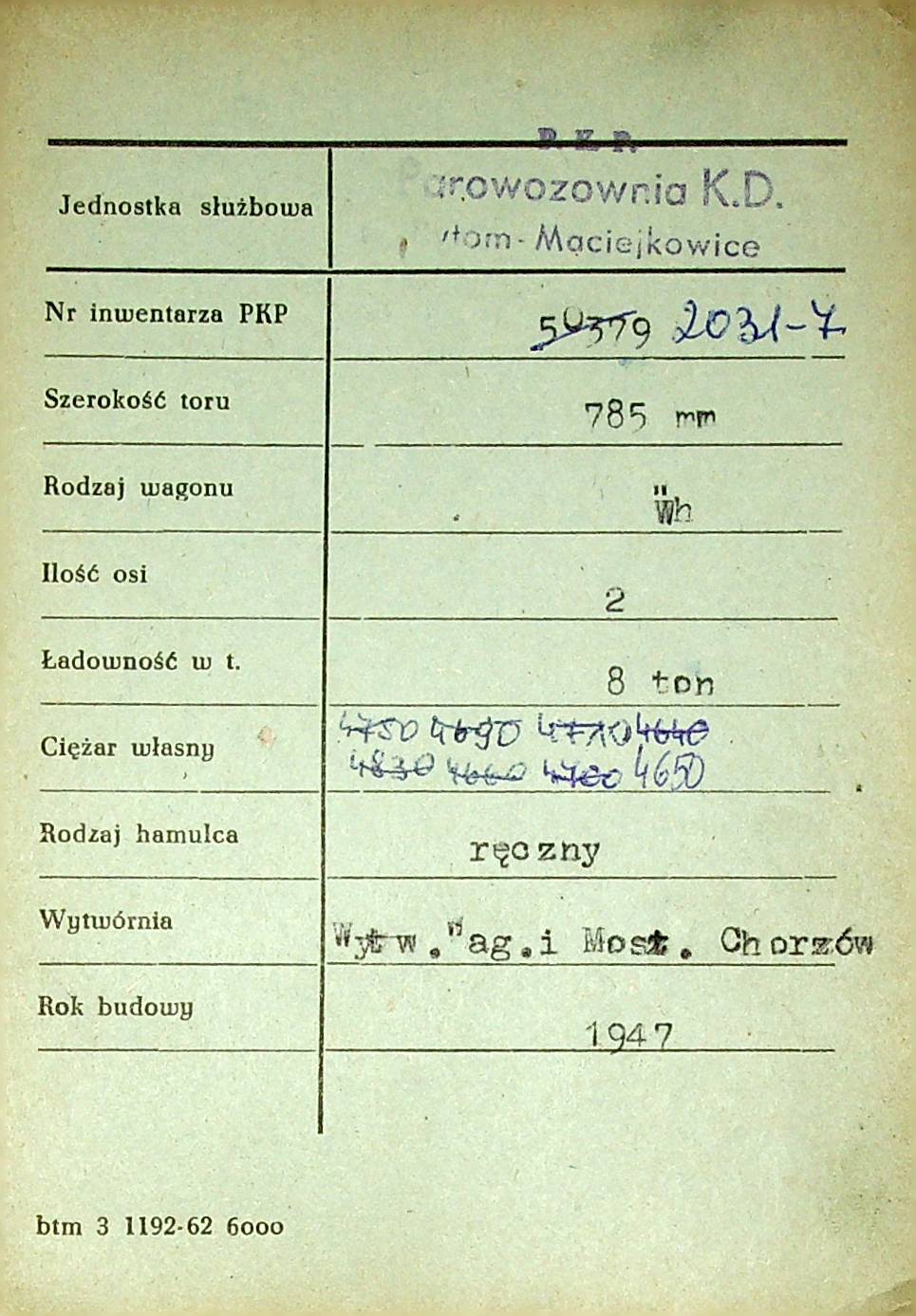 Karta wagonu Górnośląskich Kolei Wąskotorowych |