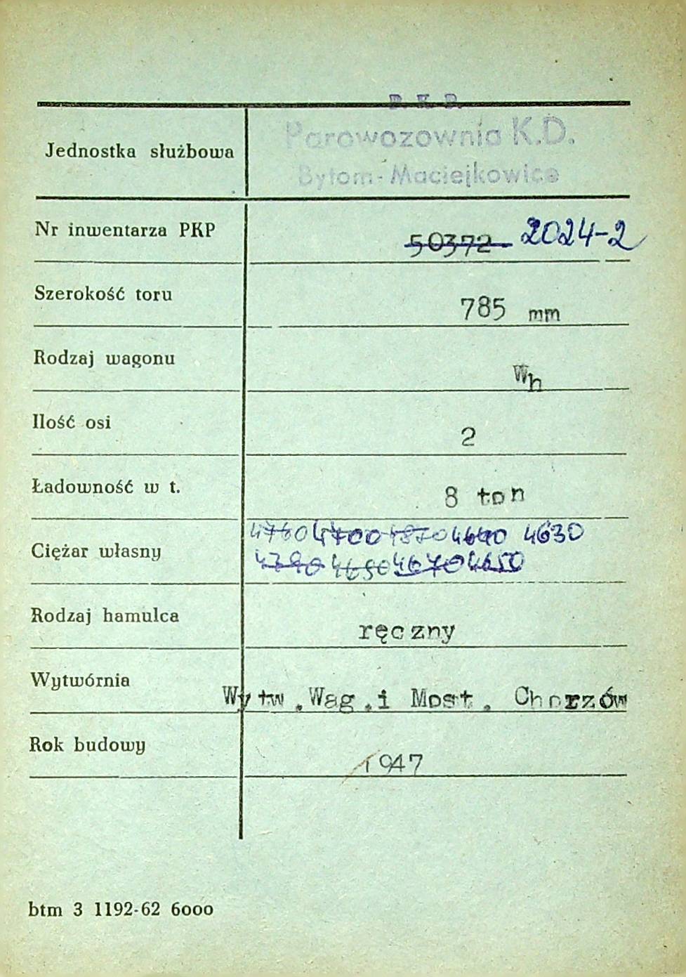 Karta wagonu Górnośląskich Kolei Wąskotorowych |