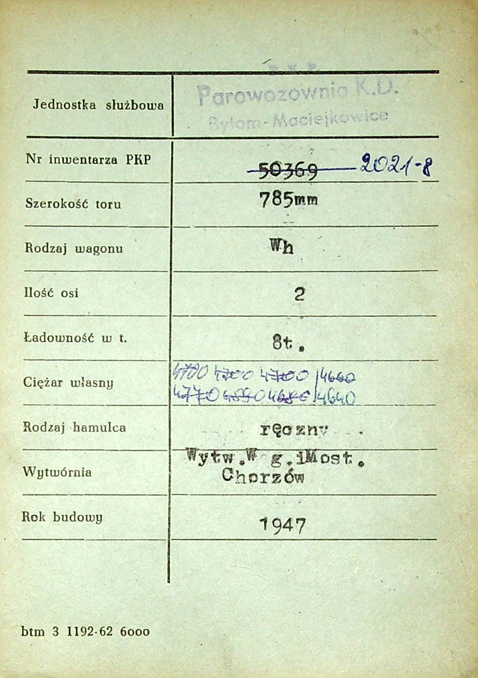 Karta wagonu Górnośląskich Kolei Wąskotorowych |