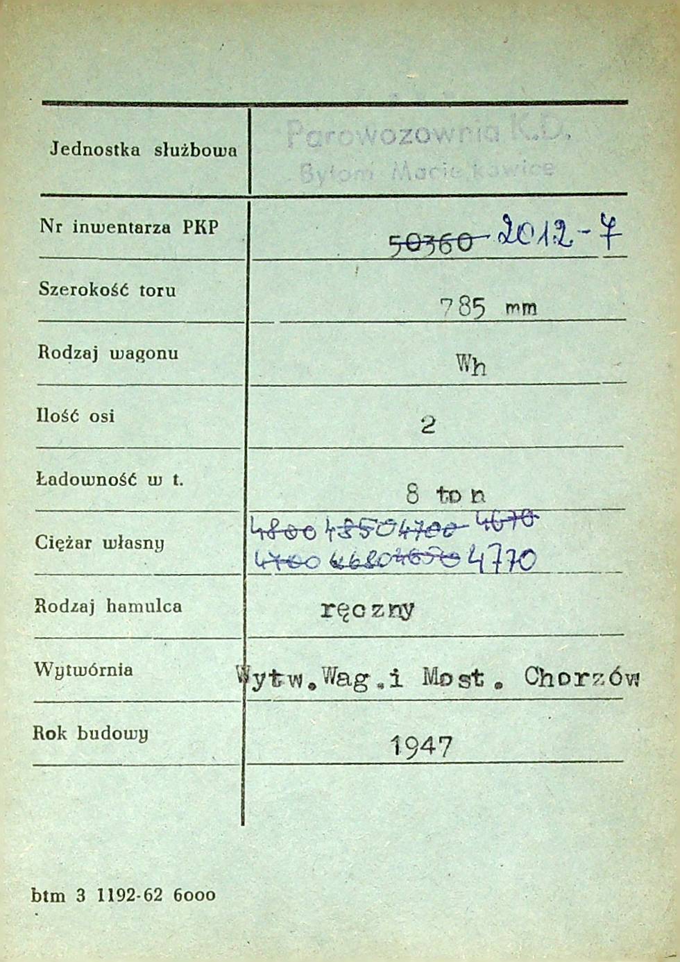 Karta wagonu Górnośląskich Kolei Wąskotorowych |
