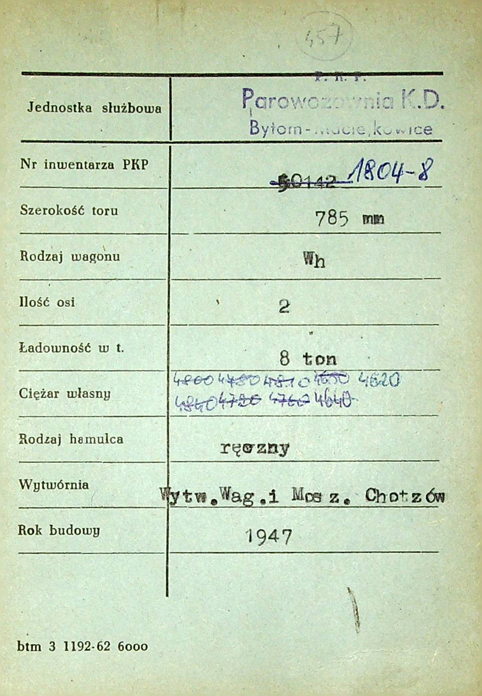 Karta wagonu Górnośląskich Kolei Wąskotorowych |