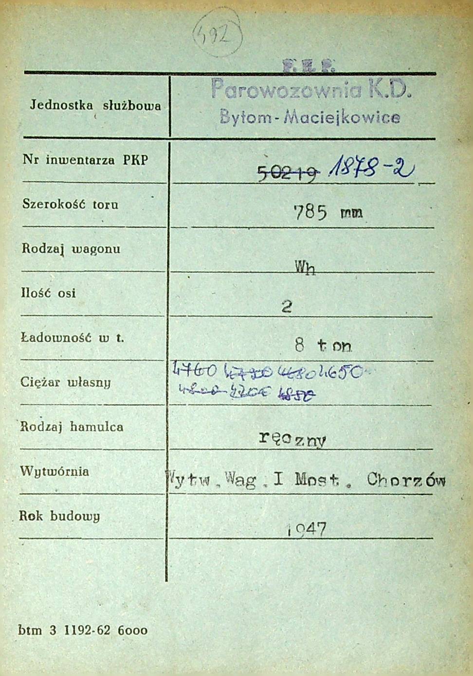 Karta wagonu Górnośląskich Kolei Wąskotorowych |