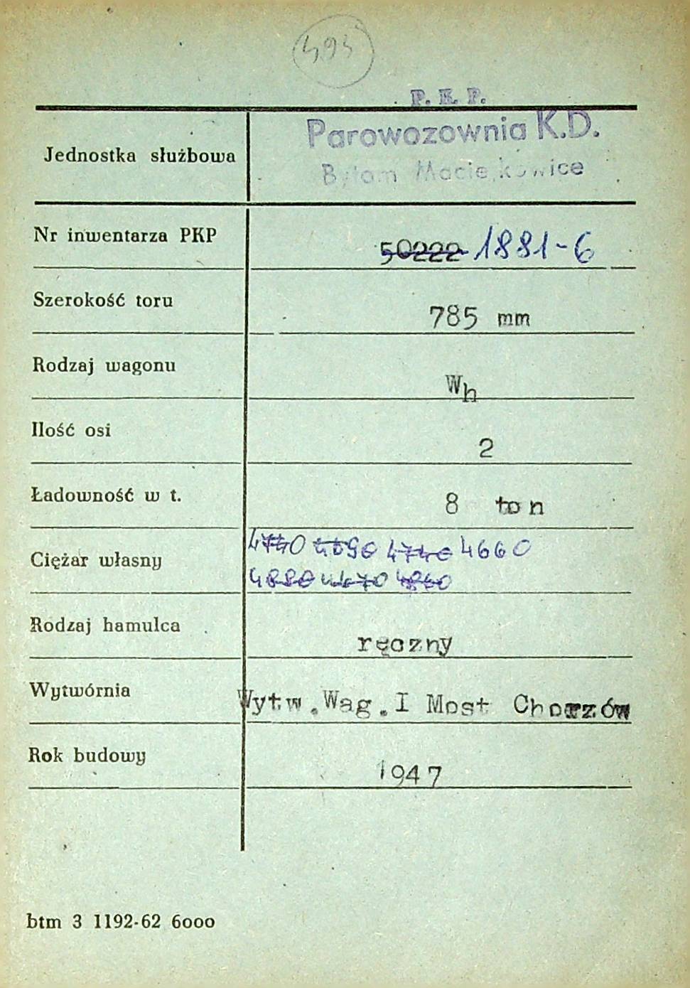 Karta wagonu Górnośląskich Kolei Wąskotorowych |