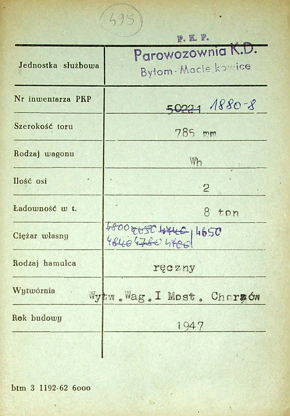 Karta wagonu Górnośląskich Kolei Wąskotorowych |