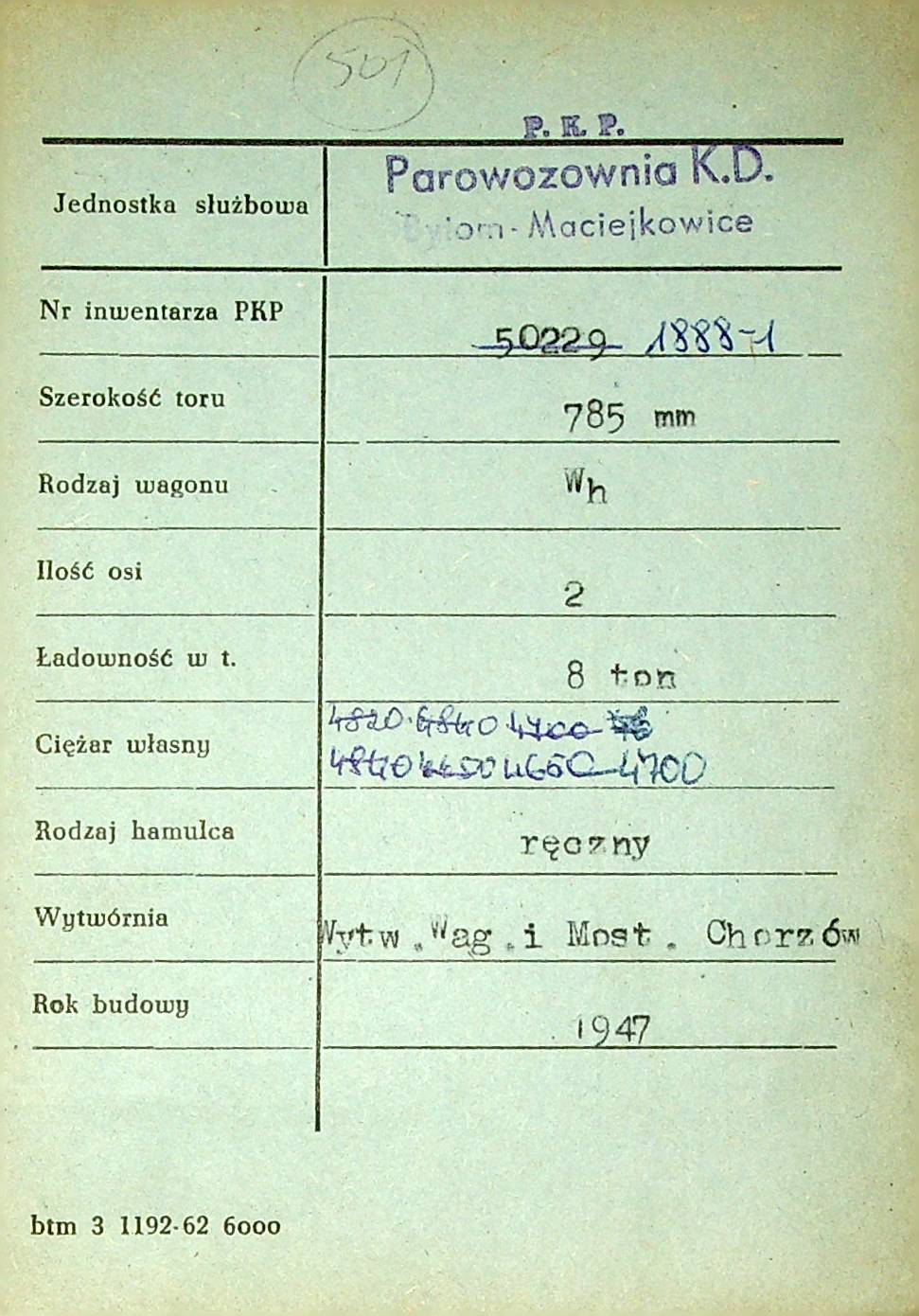 Karta wagonu Górnośląskich Kolei Wąskotorowych |