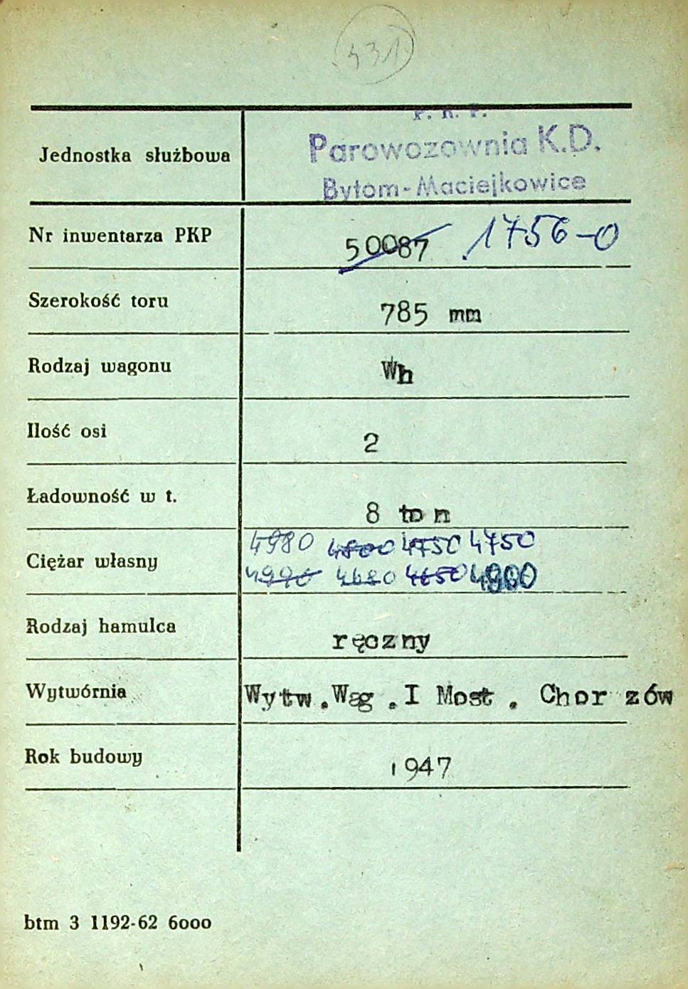 Karta wagonu Górnośląskich Kolei Wąskotorowych |