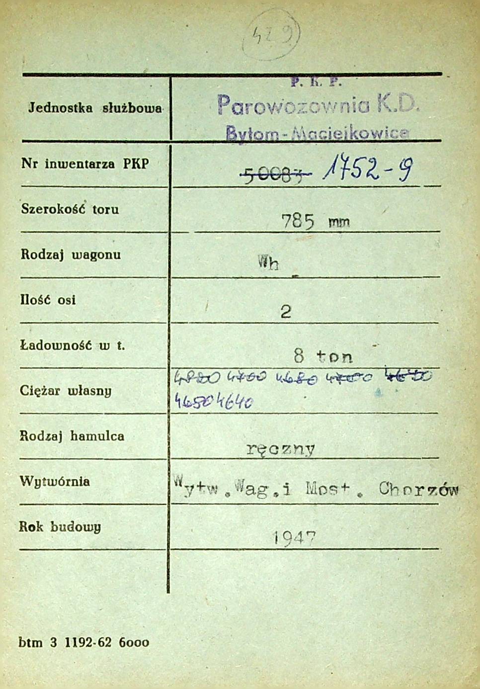 Karta wagonu Górnośląskich Kolei Wąskotorowych |