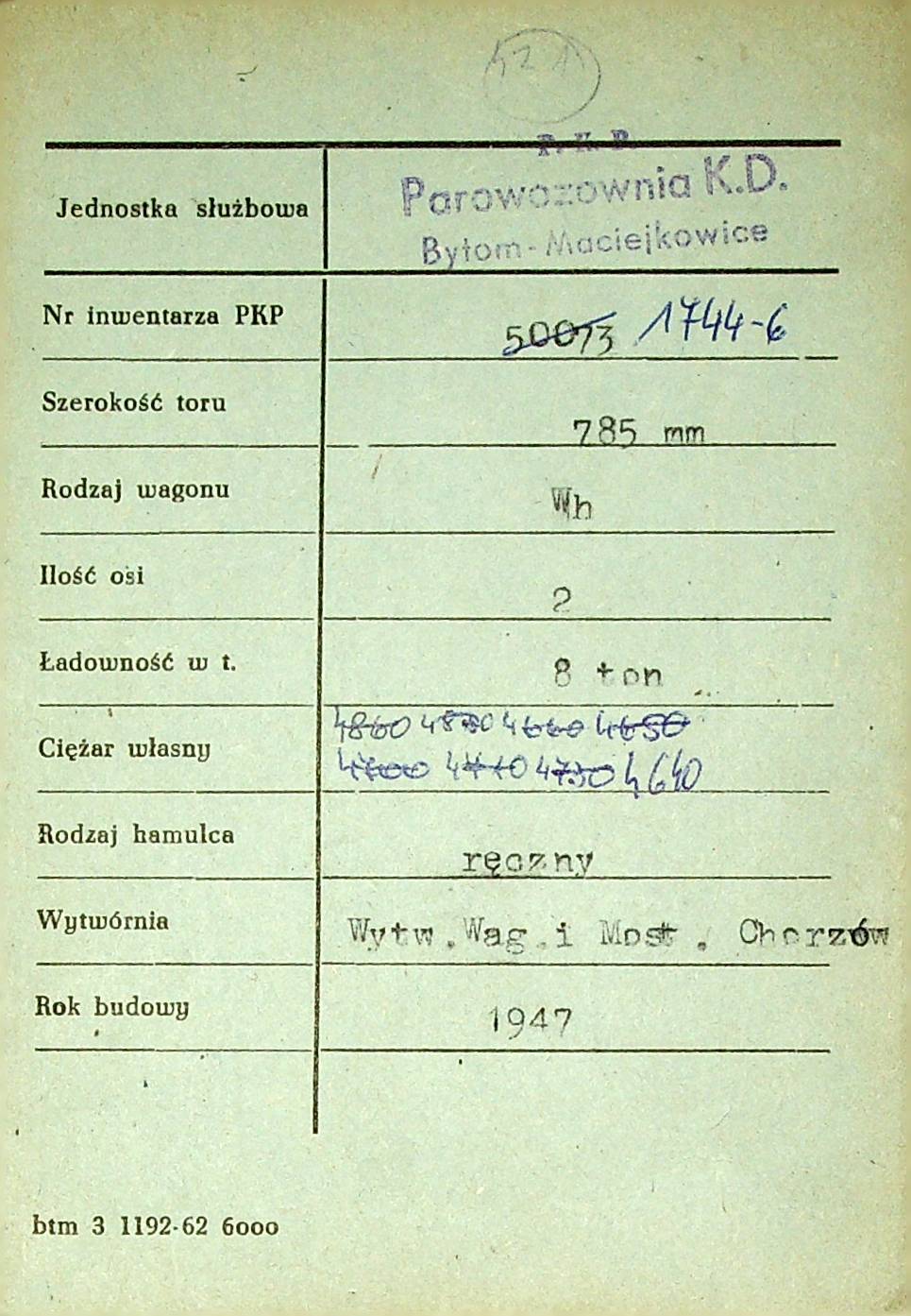Karta wagonu Górnośląskich Kolei Wąskotorowych |