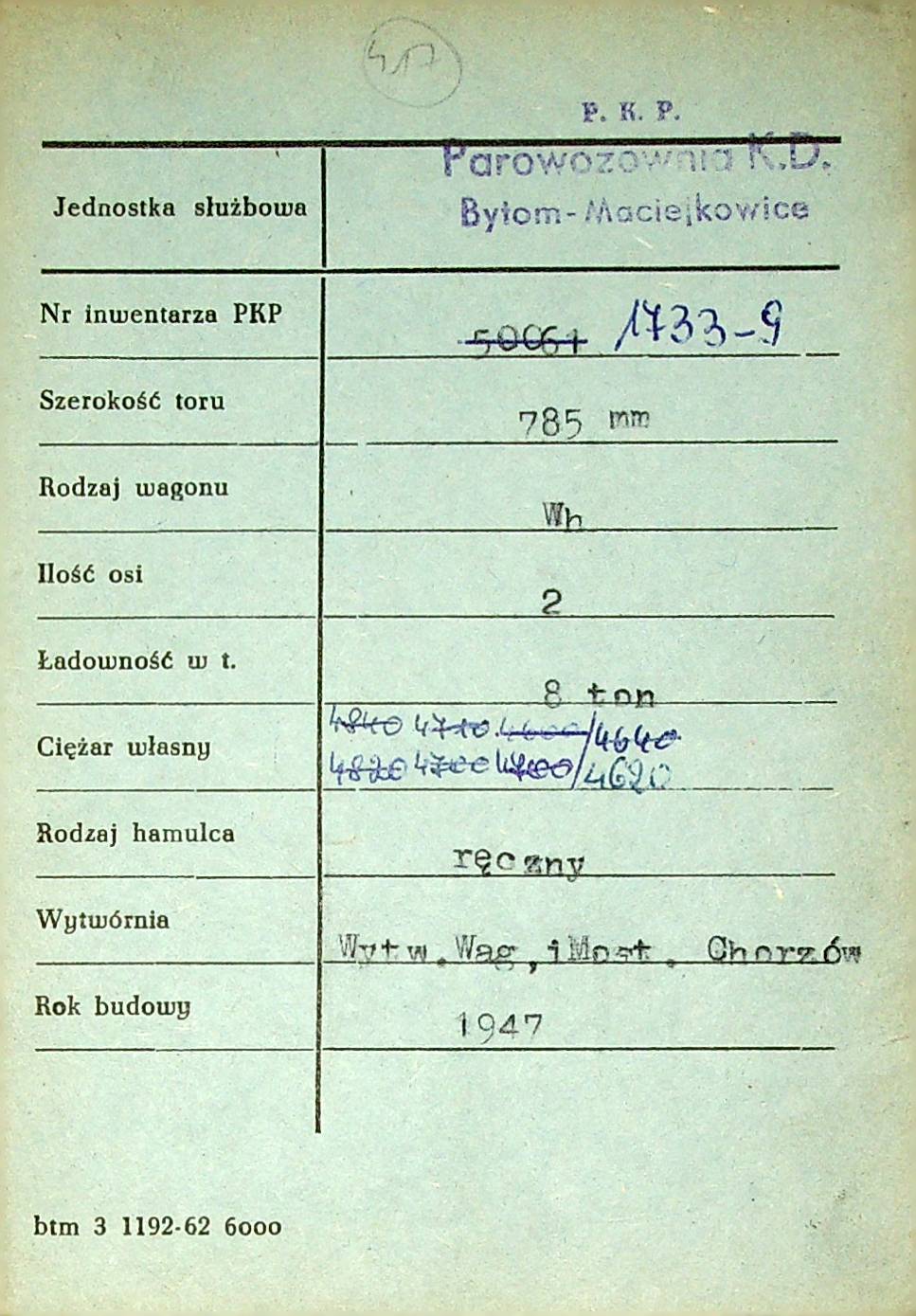 Karta wagonu Górnośląskich Kolei Wąskotorowych |
