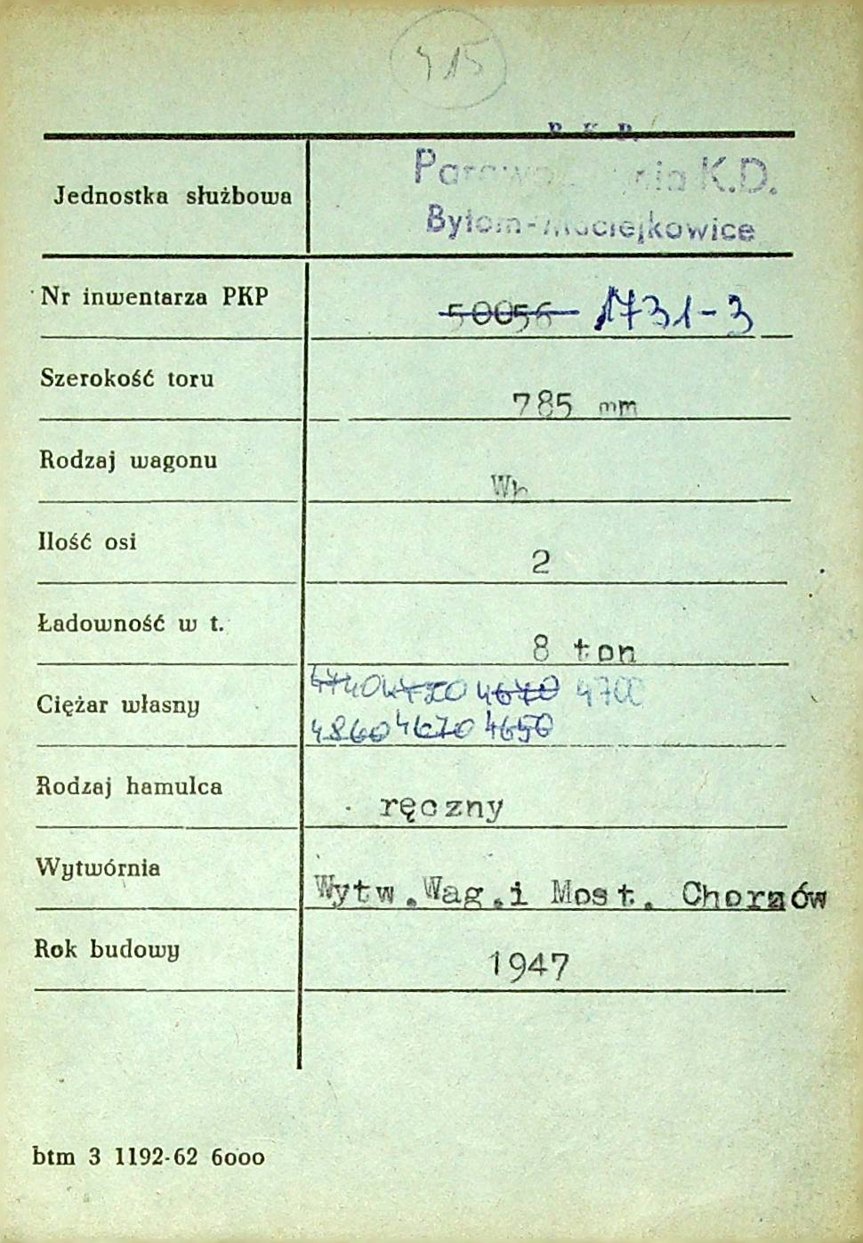 Karta wagonu Górnośląskich Kolei Wąskotorowych |