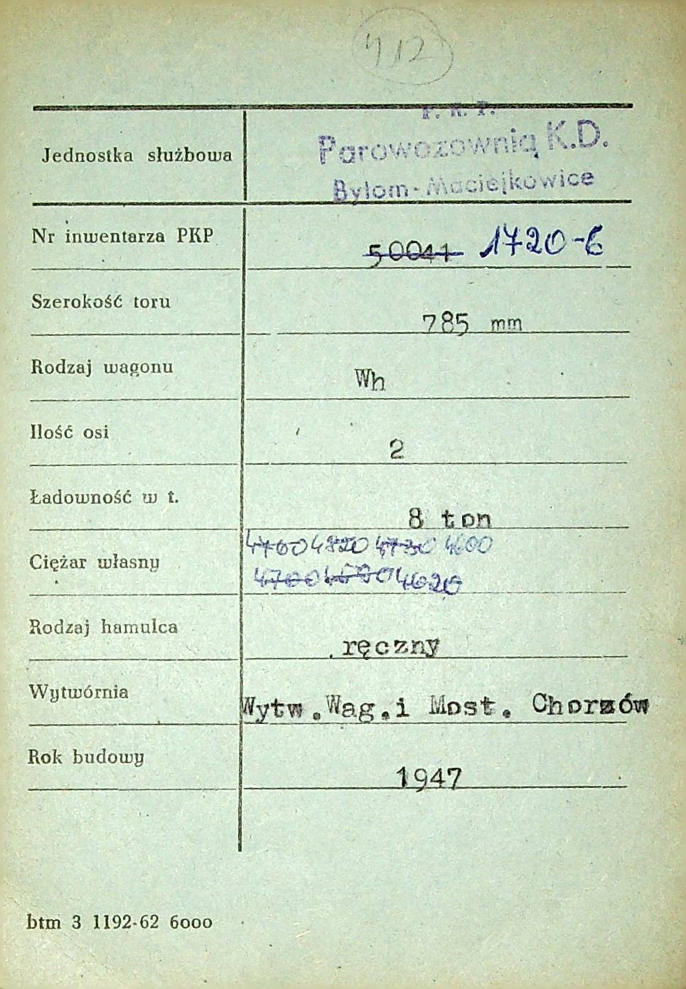 Karta wagonu Górnośląskich Kolei Wąskotorowych |