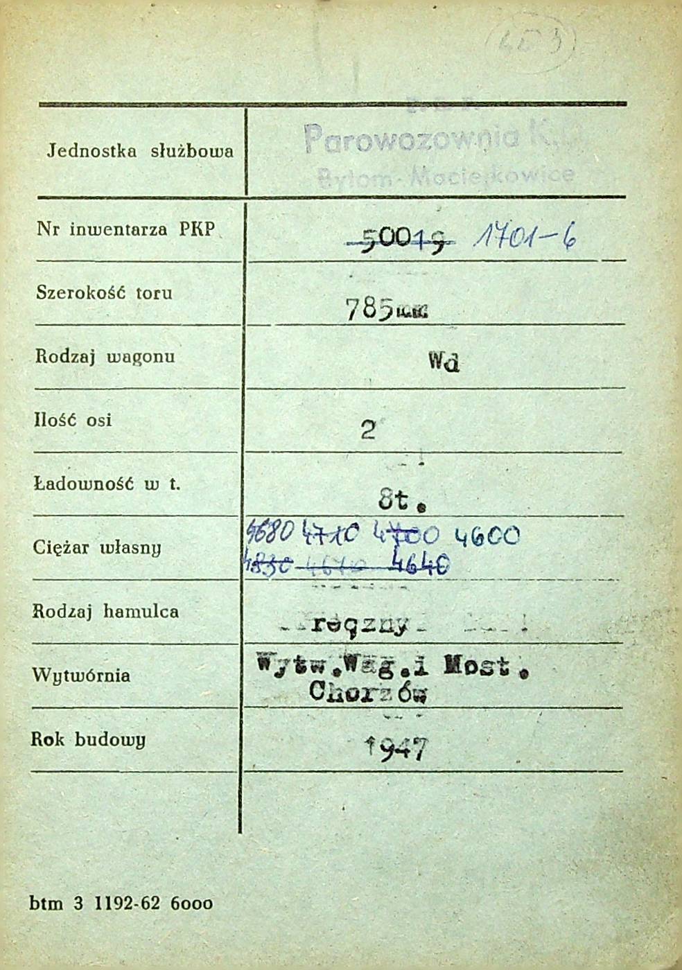 Karta wagonu Górnośląskich Kolei Wąskotorowych |