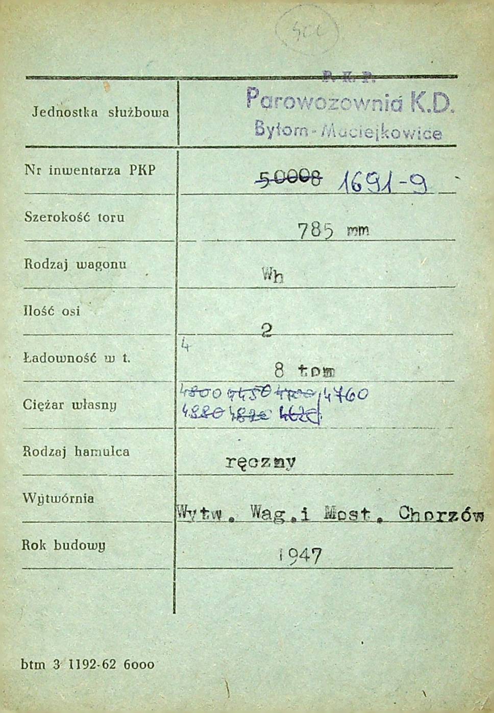 Karta wagonu Górnośląskich Kolei Wąskotorowych |