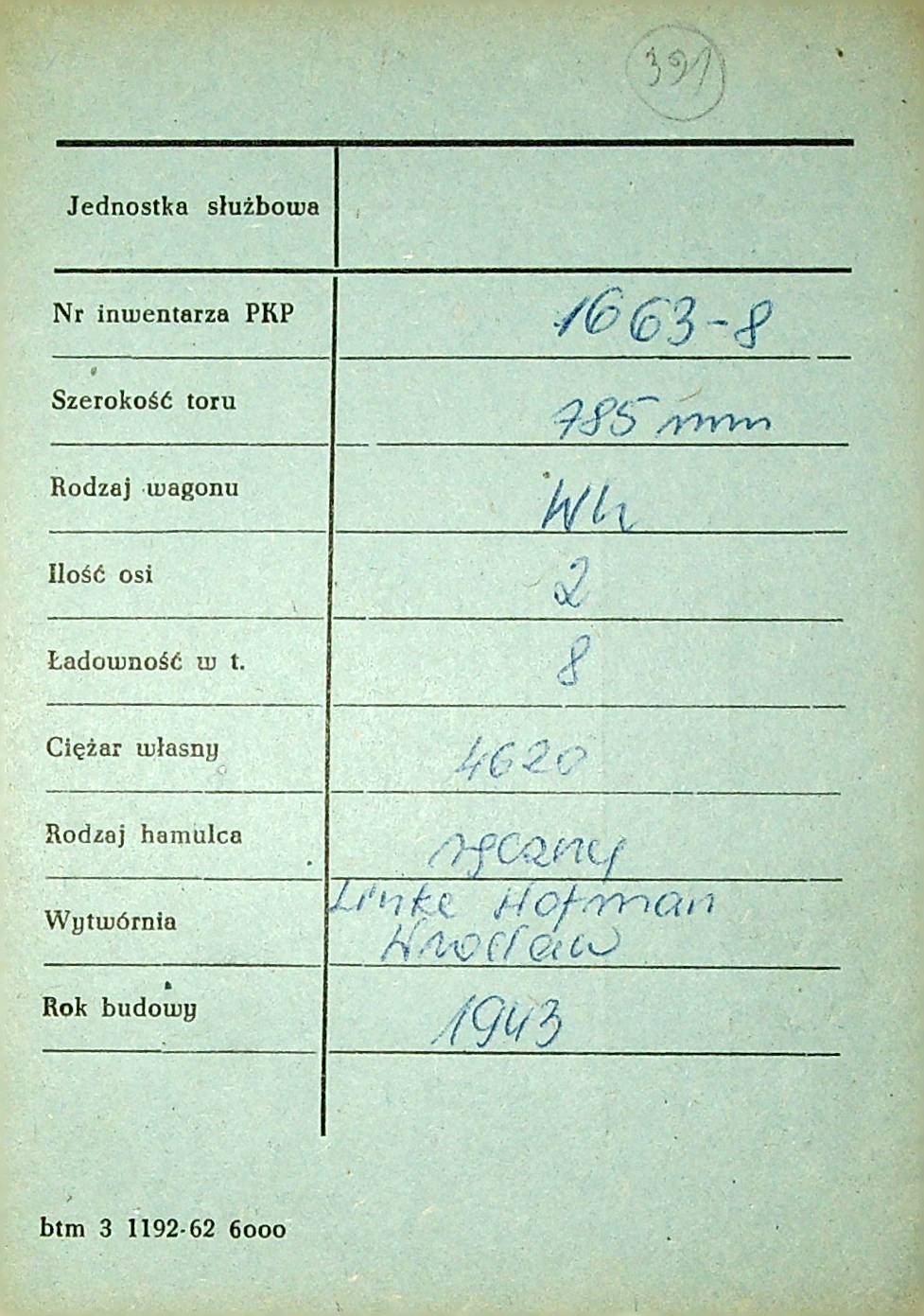 Karta wagonu Górnośląskich Kolei Wąskotorowych |