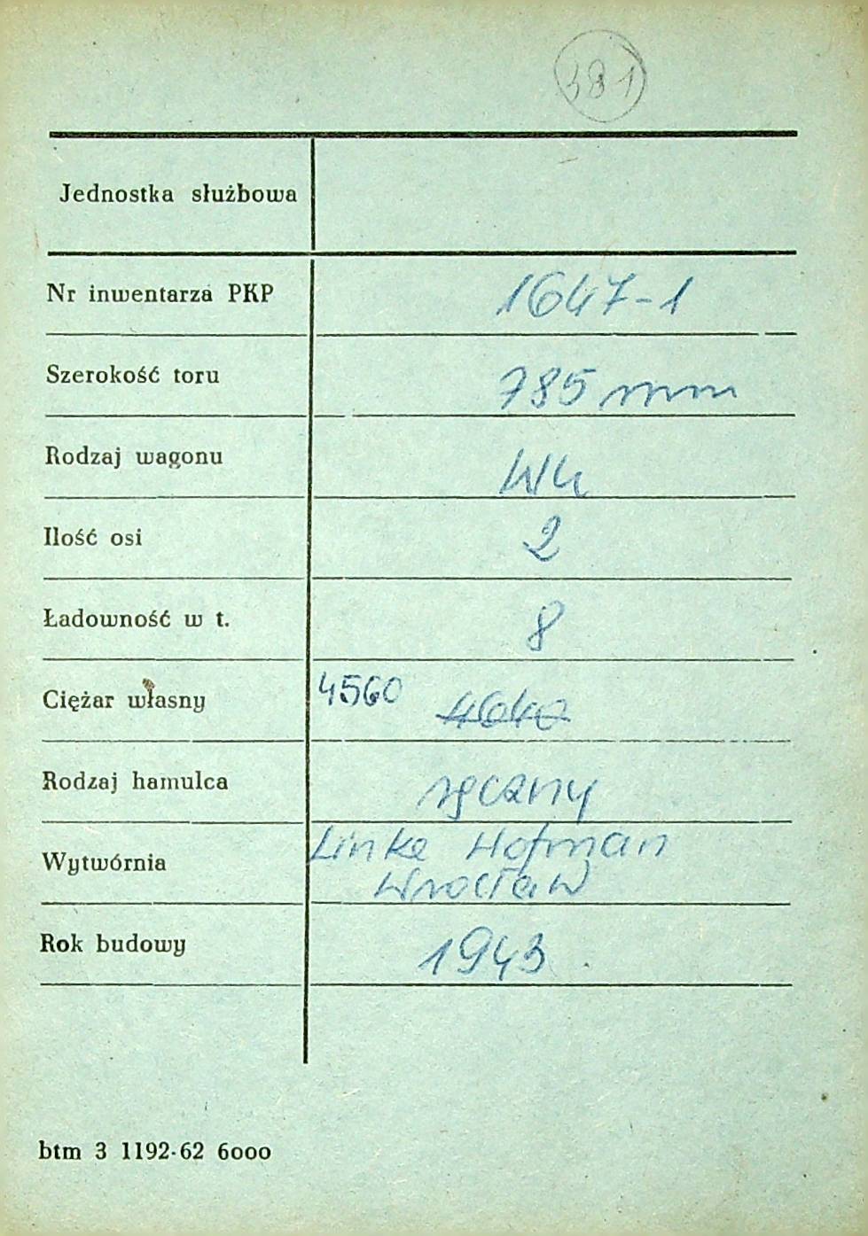 Karta wagonu Górnośląskich Kolei Wąskotorowych |