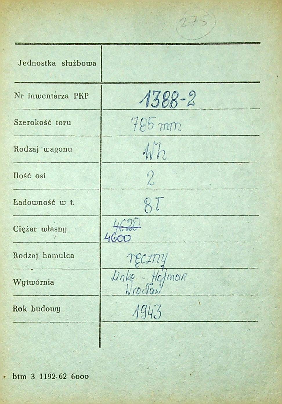 Karta wagonu Górnośląskich Kolei Wąskotorowych |