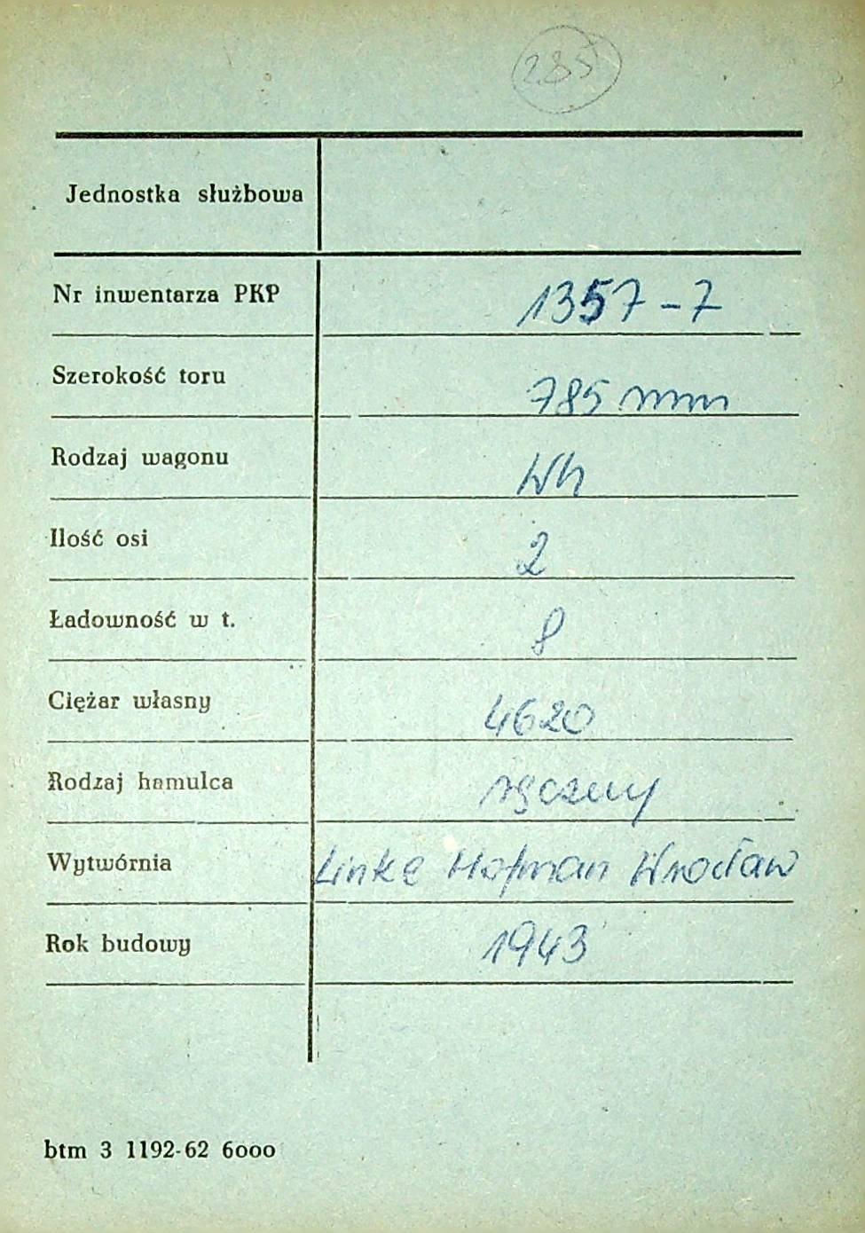Karta wagonu Górnośląskich Kolei Wąskotorowych |