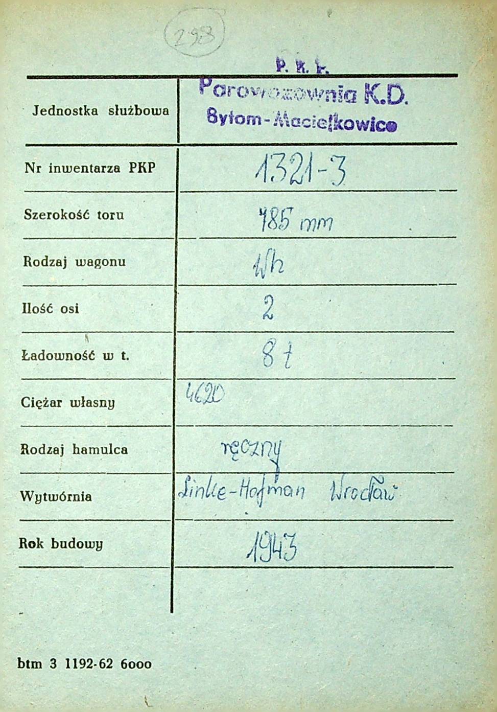 Karta wagonu Górnośląskich Kolei Wąskotorowych |