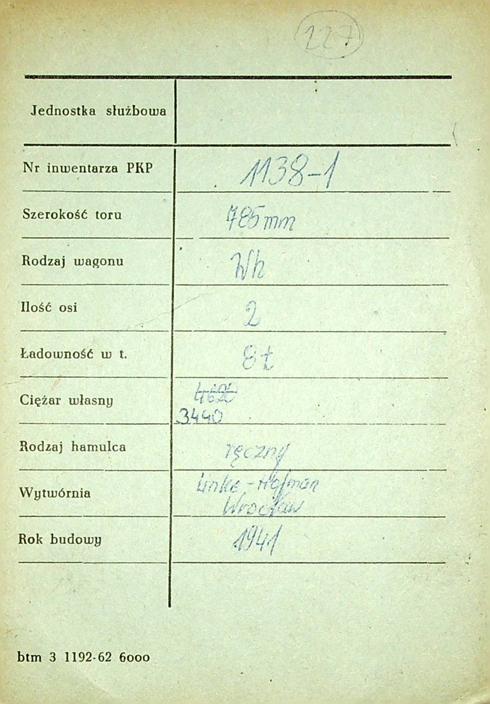 Karta wagonu Górnośląskich Kolei Wąskotorowych |
