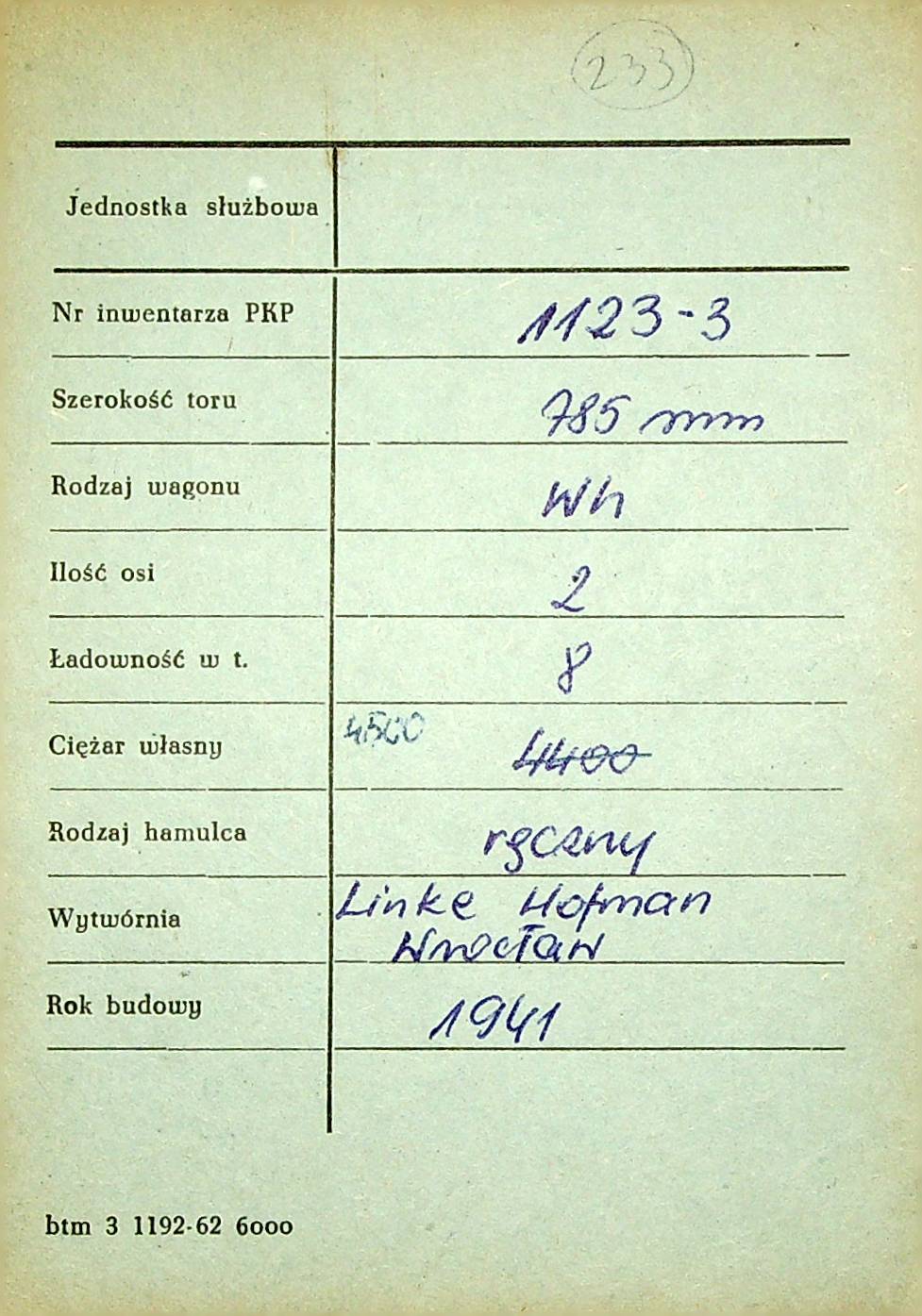 Karta wagonu Górnośląskich Kolei Wąskotorowych |