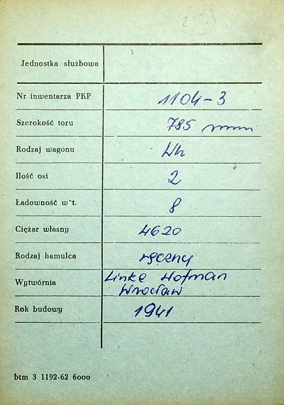 Karta wagonu Górnośląskich Kolei Wąskotorowych |