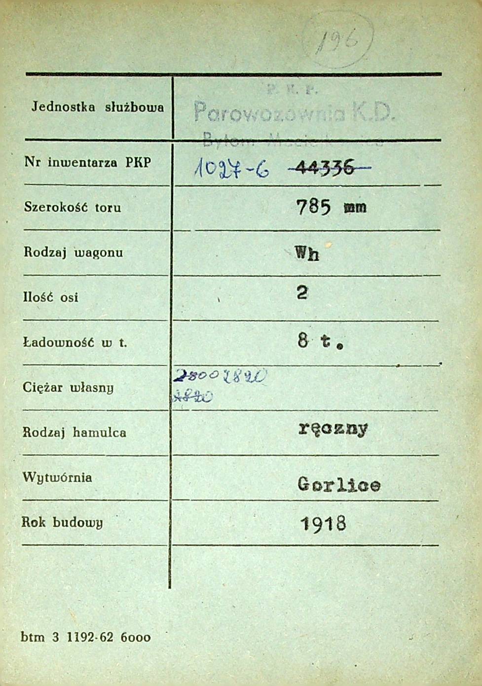 Karta wagonu Górnośląskich Kolei Wąskotorowych |