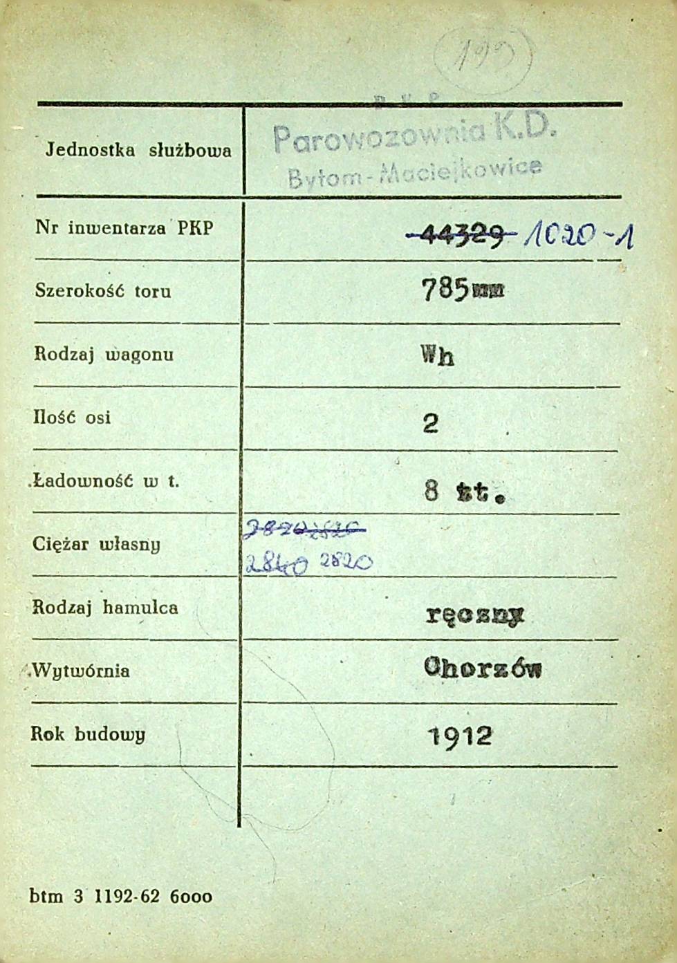 Karta wagonu Górnośląskich Kolei Wąskotorowych |