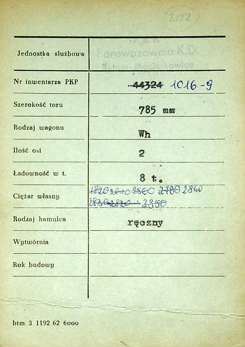 Karta wagonu Górnośląskich Kolei Wąskotorowych |