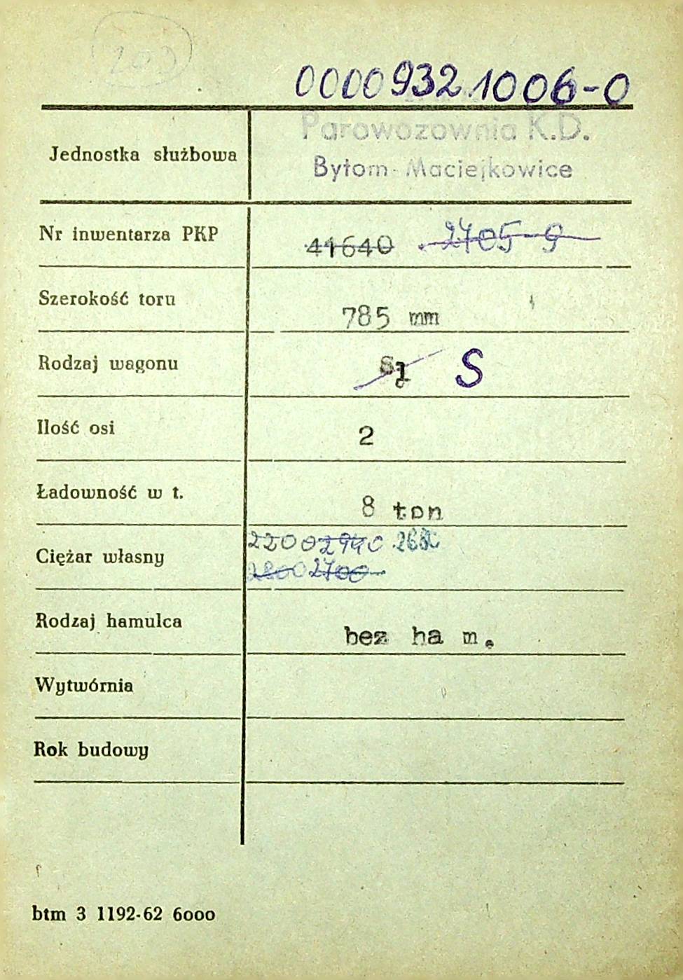 Karta wagonu Górnośląskich Kolei Wąskotorowych |