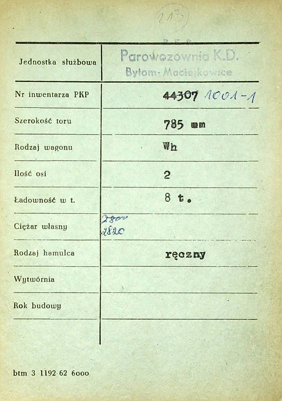 Karta wagonu Górnośląskich Kolei Wąskotorowych |
