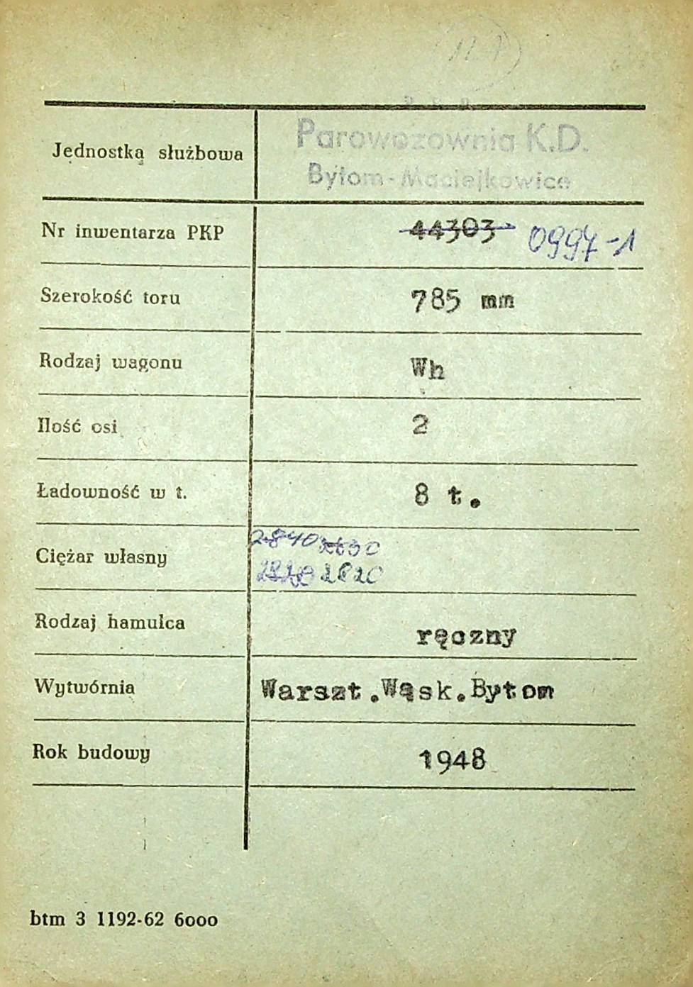 Karta wagonu Górnośląskich Kolei Wąskotorowych |